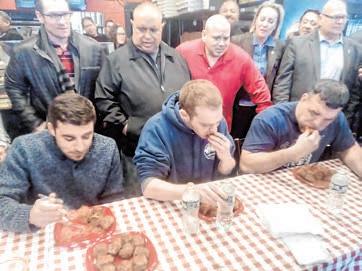 From left: Councilman Lou Imbroto, Tom Harrigan and Dave Brunelli at DiMaggio’s meatball eating contest (Photo by Dave Gil de Rubio)