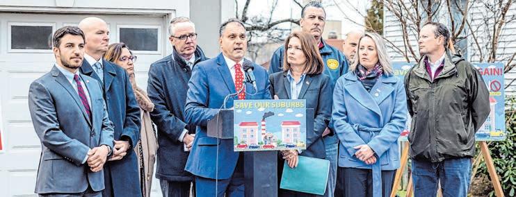 Local officials and neighbors gathered in Manhasset to denounce Governor Hochul’s plan to remove zoning control of communities from local municipalities, potentially resulting in thousands of apartments flooding single-family neighborhoods and creating spot zoning in which large apartment complexes can be built beside single family homes.