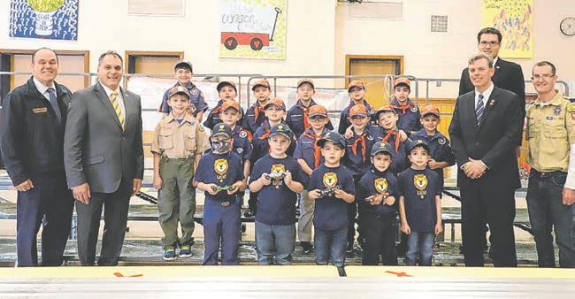 Oyster Bay Town Supervisor Joseph Saladino (second from left) and Oyster Bay Town Councilman Thomas Hand (far left) recently joined with Nassau County Legislator James D. Kennedy (front row, second from the right) and New York State Assemblyman John Mikulin (second row, far right) to congratulate Cubmaster Eric Stashin and Cub Scout Pack 590 for a successful annual Pinewood Derby held at Lockhart Elementary School. The Pinewood Derby teaches Cub Scouts about craftsmanship, sportsmanship and respect for others through friendly competition. Saladino commended the members and leaders of Cub Scout Pack 590 for their hard work, dedication and integrity, which serve as an inspiration to all.