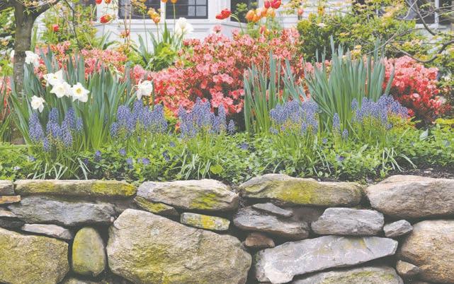 vibrant flowerbeds and potted plants around the property.