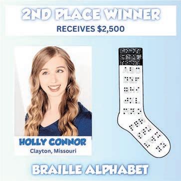 The second-place winner, Holly Conner of Clayton, Missouri, will receive a $2,500 scholarship for her Braille Alphabet Sock design. Third place winner, Avery Parsley of El Dorado, Kansas, will receive a $1,000 scholarship for her Rocket Launch socks.