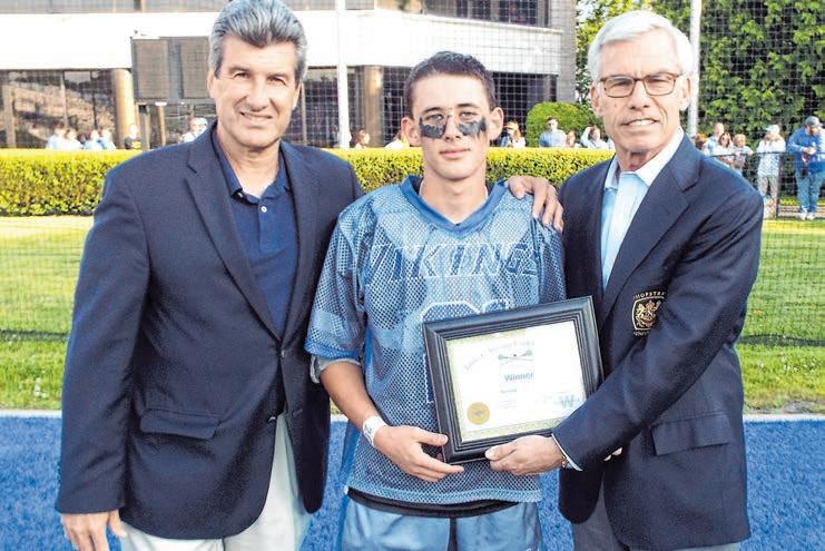 Cal Gober of Paul D. Schreiber Senior High School in Port Washington receives the James C. Metzger Lacrosse Leadership Award from James C. Metzger (right) and Vincent J. Sombrotto of Whitmore–The Agency. M. Virgintino (left). (Contributed photo)