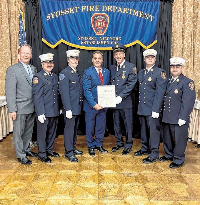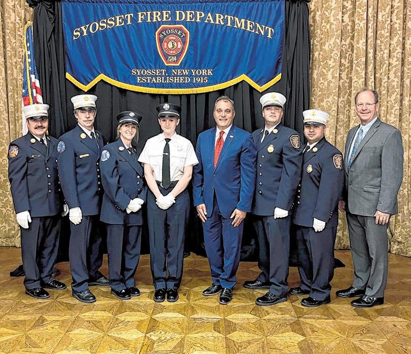 (first photo, center left; second photo center right) recently attended the Syosset Fire District’s 108th Annual Inspection and Installation Dinner to honor the outgoing Ex Chief, Dr. Peter Silver (first photo, center right), and welcome Syosset Junior Firefighter, Kyra Kozey (second photo, center left), as the first female President of the Nassau County Junior Firefighters Association. (Photos courtesy the Town of Oyster Bay)