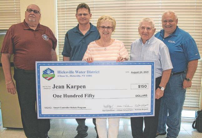 The Hicksville Water District (HWD) Board of Commissioners recently invited resident Jean Karpen to the district’s headquarters to present her with a giant check for $150. Karpen was the first recipient of the district’s Smart Controller Rebate Program, which offers qualified residents a $150 rebate on smart irrigation controllers to encourage the switch to top-of-the-line technology, which helps them conserve water while they irrigate their properties.