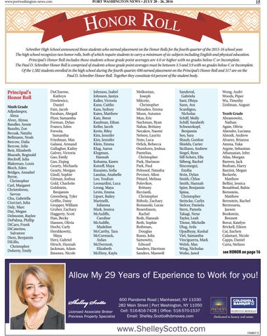 Principal’s Honor Roll Ninth Grade A djudanpor, Alexa Alvez, Alyssa Bandler, Annie Basulto, Zoe Becsak, Natalia Bellmann, Noah Bercow, Dalia Bercow, Jolie Betz, Elizabeth Bharath, Reginald Bischoff, Julia Blakeman, Louis Bloch, Eden Bridges, Annabel B yrne, Christopher Carl, Margaret C hristoforou, Savvas Chu, Gabriella Ciorciari, Julia Daly, Marc Day, Megan Delmonte, Baylee DePalma, Phillip DiCaro, Frank D iCaterino, Salvatore Dietz, Benjamin D iLillo, Christopher Doherty, Emily