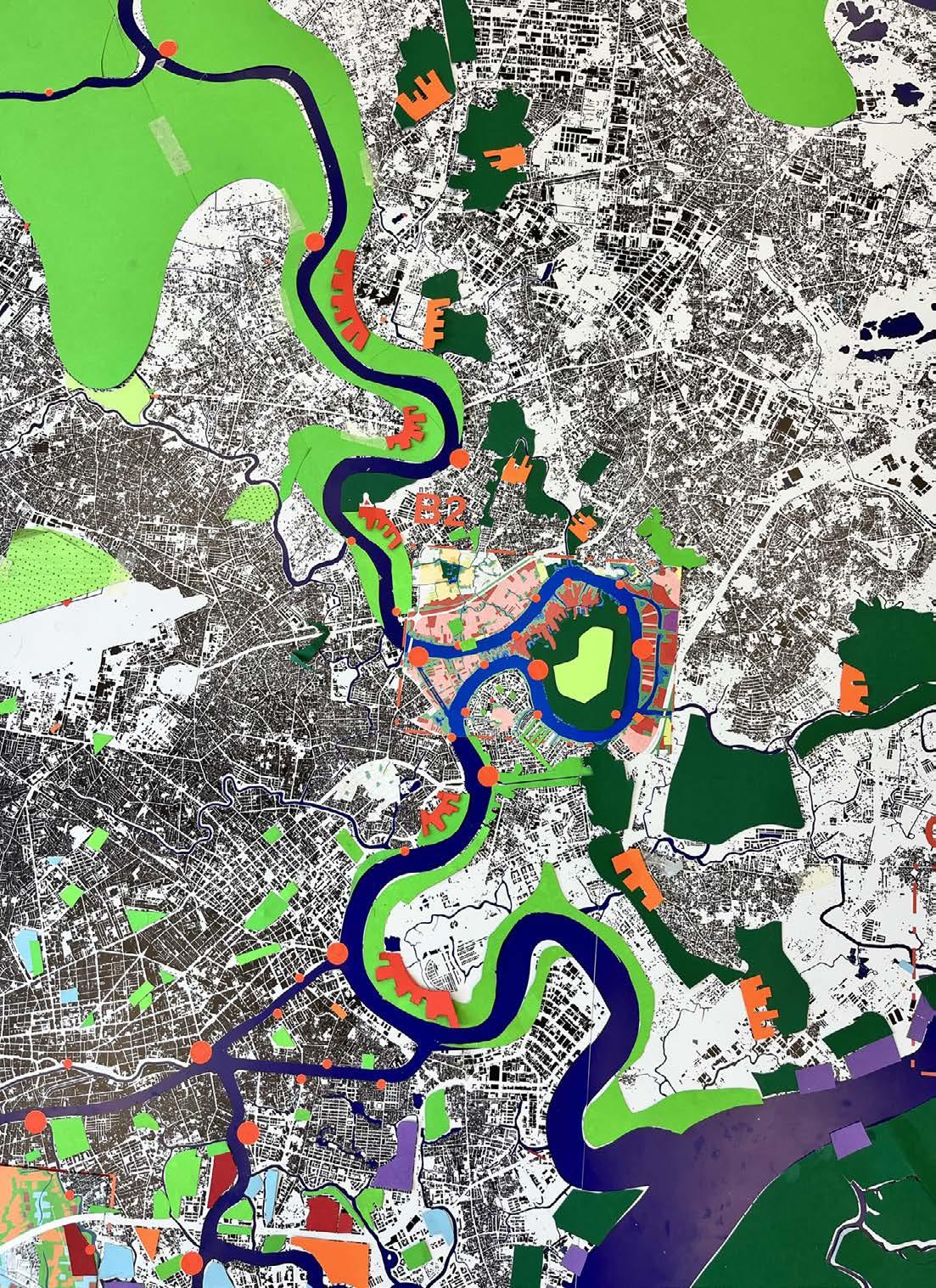 The main idea lies in preserving the core of the island as a metropolitan park by reforesting a mangrove buffer on the periphery - for water retention and remediation and biodiversity reconstruction - and preserving the productive center, with a dyke separating the human and non-human. At the same time, a “barcode” urbanism was introduced in order to integrate development along blue-green corridors and transform the river into a democratized connector through public riverfront spaces and a car-free water transport system. Special focus was given in 2 key areas on the west and north edge, investigating the overlapping of tropical landscape and high density urbanism in a 1:500 scale transect and site plan.