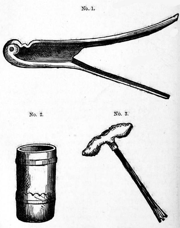 In Ceylon these instruments are used: the Girri (No. 1.) for cutting the areca nut, and the Wanggedi (No. 2) and Moolgah (No. 3), a kind of mortar and pestle for mincing and intimately mixing the ingredients together.