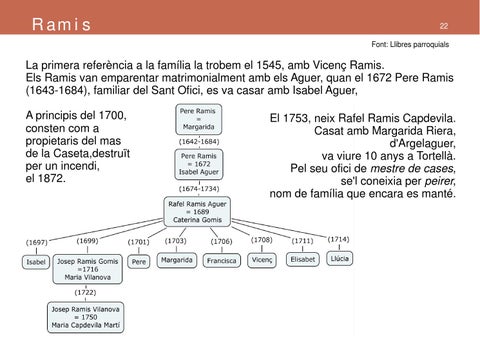 El 1753, neix Rafel Ramis Capdevila. Casat amb Margarida Riera, d'Argelaguer, va viure 10 anys a Tortellà. Pel seu ofici de mestre de cases, se'l coneixia per peirer, nom de família que encara es manté.