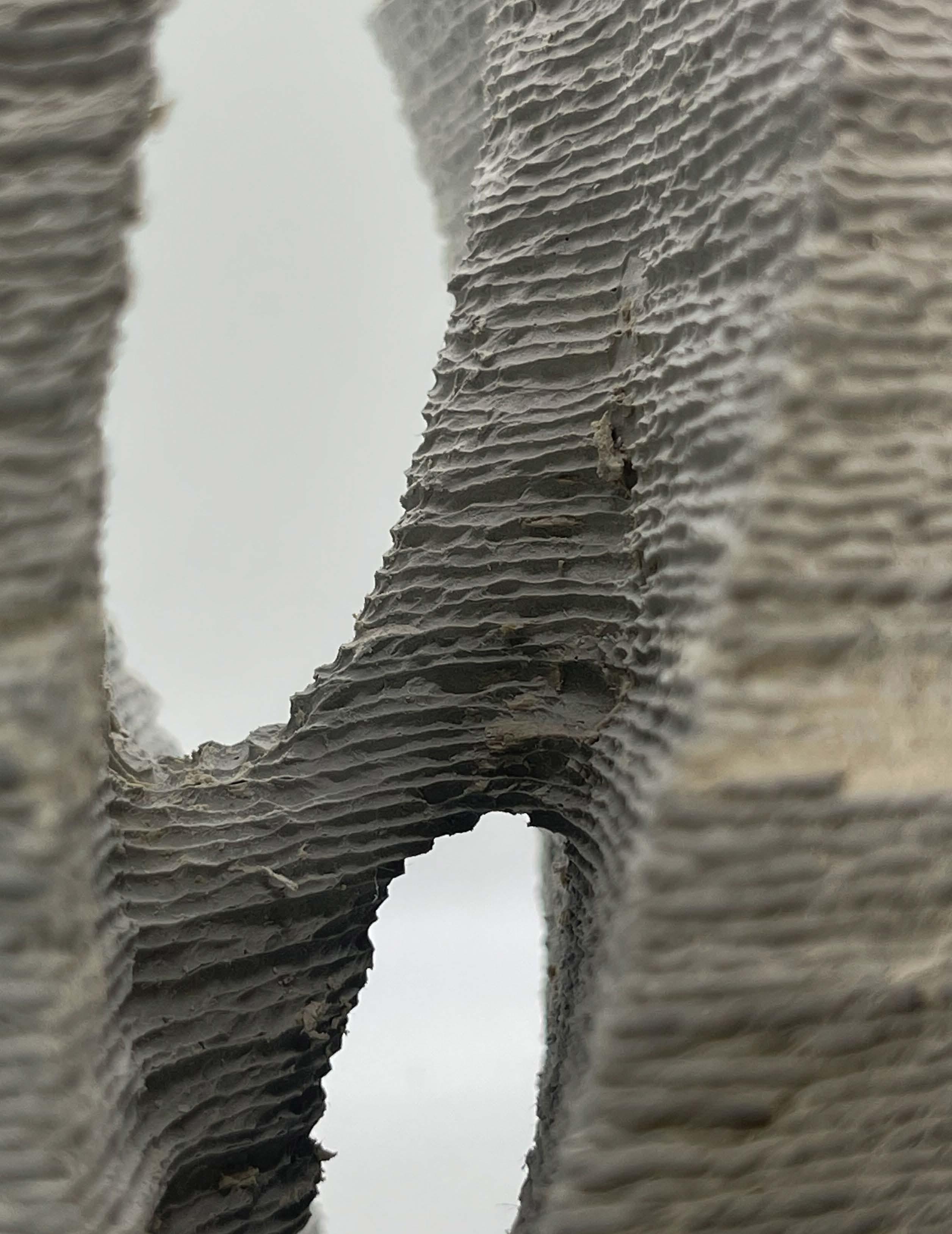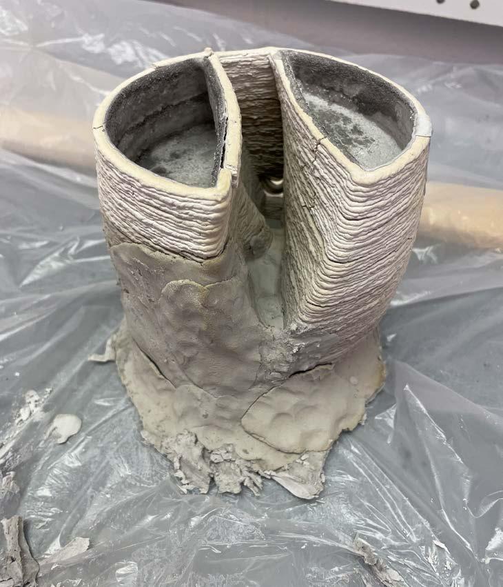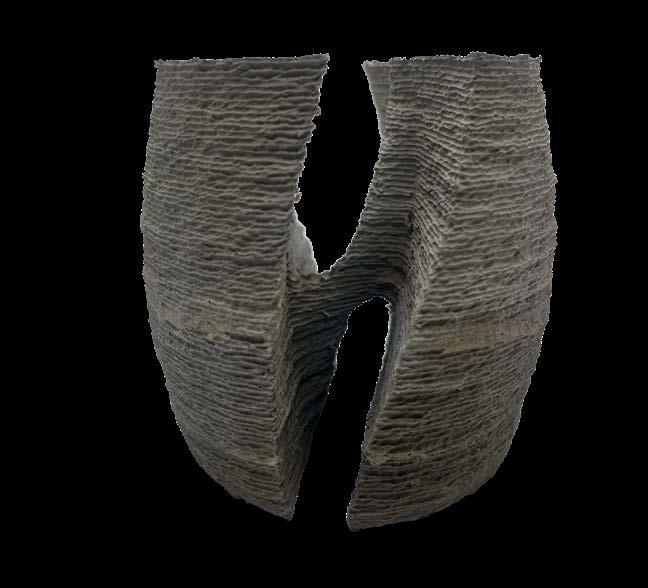 An investigation of recyclable, paper clay, and concrete formwork was done with research seeking to explore the relationship between span limits and aperture creation with clay 3D fabrication. The fabrication was done in three phases (3D printing, assembly of units, and casting with rockite mix) as each of them had their own unique processes and how to successfully complete them. To investigate the relationship between span limits and aperture creation, a series of 4” x 4” x 4” experimental clay 3D printing tests were conducted. The experiment’s objective was to identify the best angle for the bridge and test printing these forms in a continuous, single tool path instead of using separate components