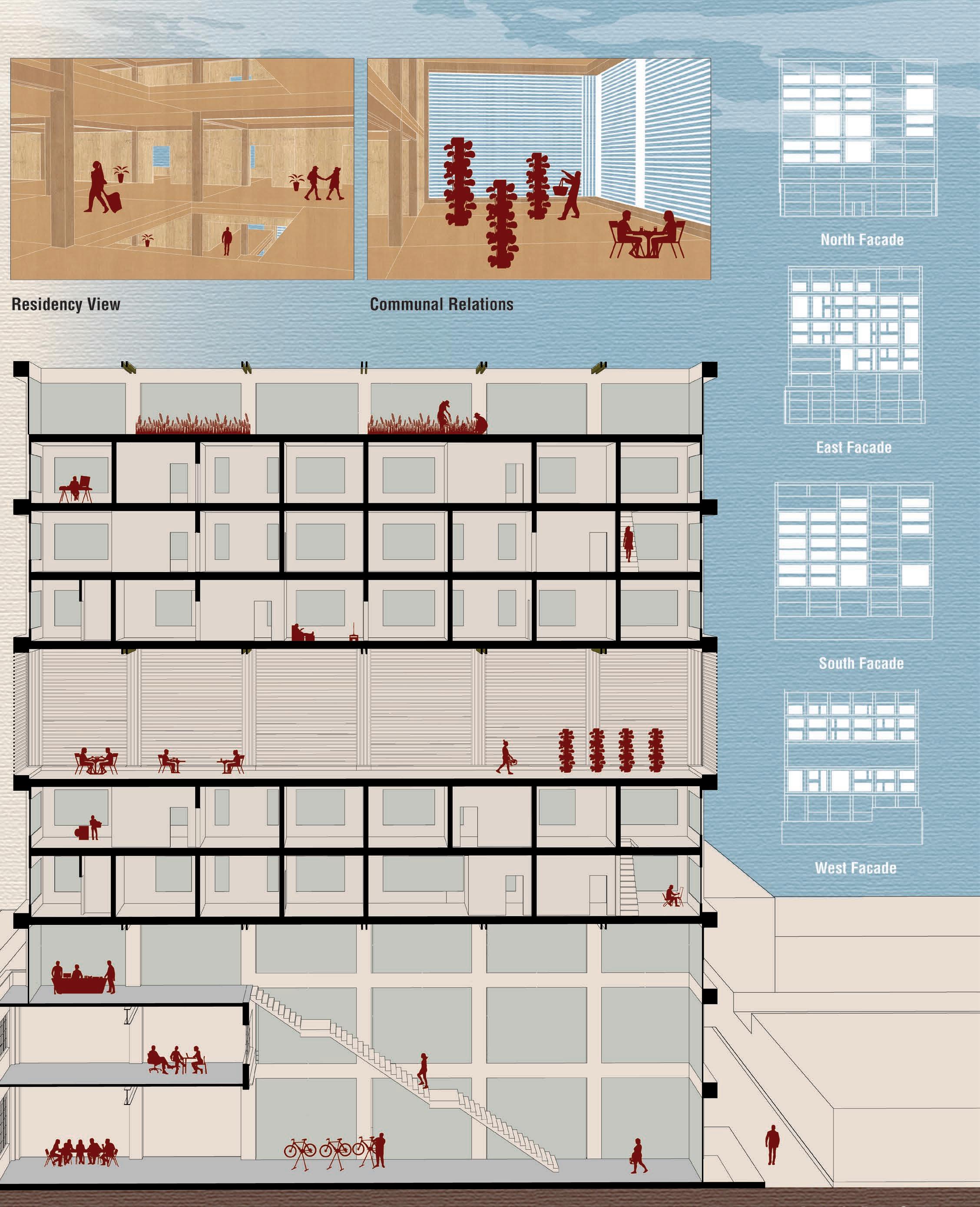 The center’s design draws from a tie between cultural interaction and ecological research based on the local Boston Harbor, including insight into urban technology and coastal ecosystems that provided a crit-ical perspective on adapting to sea level rise with climate change. The building aims to be a hotbed for cultural diversity where many visitors can reside in spaces designed for human and non-human interac-tions, including visual and auditorial moments.