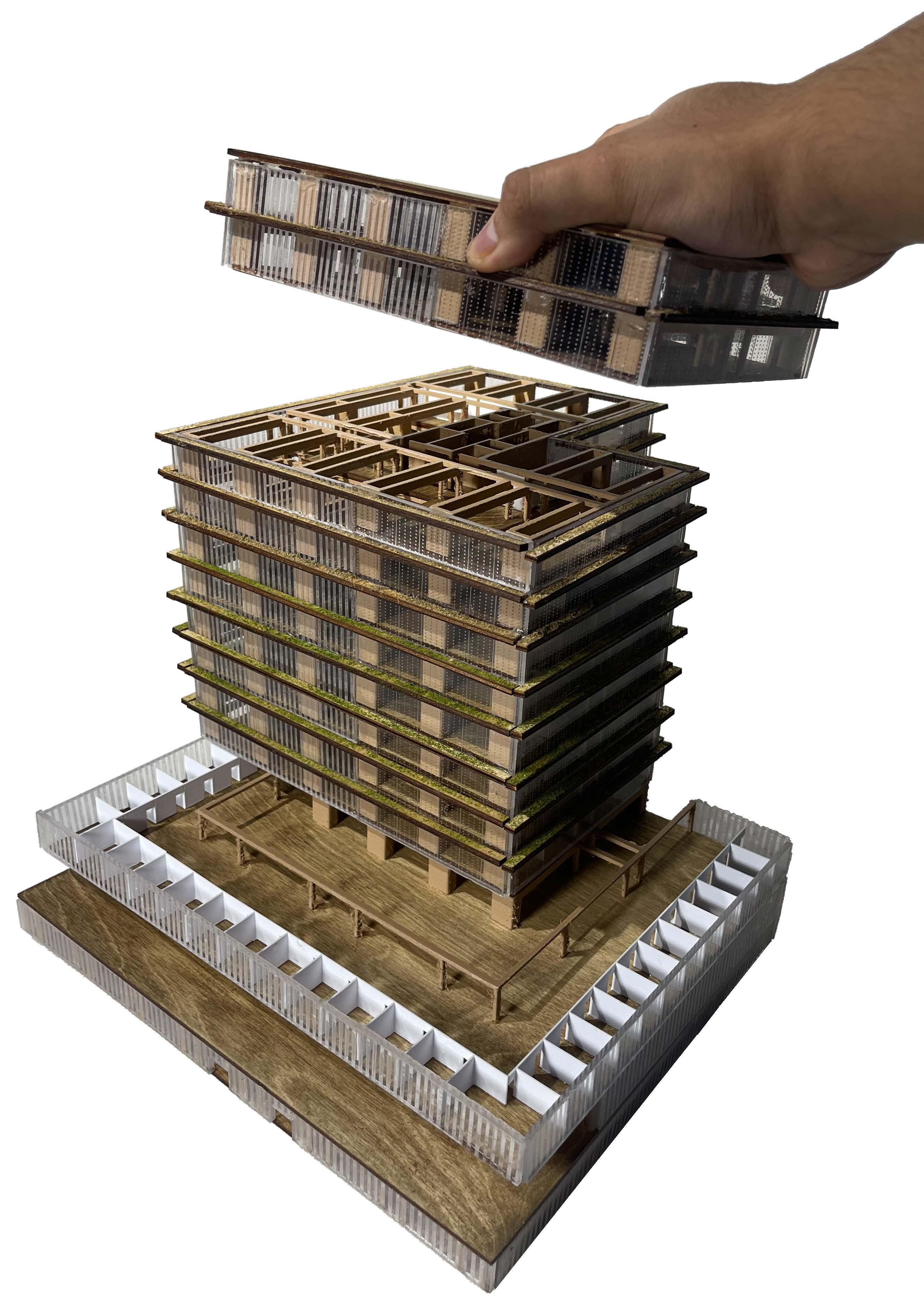 The studio participated in the 2024 ACSA student design competition “Timber in the City” which invited speculative and innovative design solutions using mass timber to add density via a vertical extension to an existing structure. The project was focused on renewable and biogenic building materials – specifically mass timber - for the design of a 50-unit, affordable housing program in a dense urban environment. Exploration of mass timber design strategies were done to better fit the site - from sourcing and manufacturing to structural capabilities, assemblies, thermal properties and the pre-fabrication potentialities of this carbon negative resource.