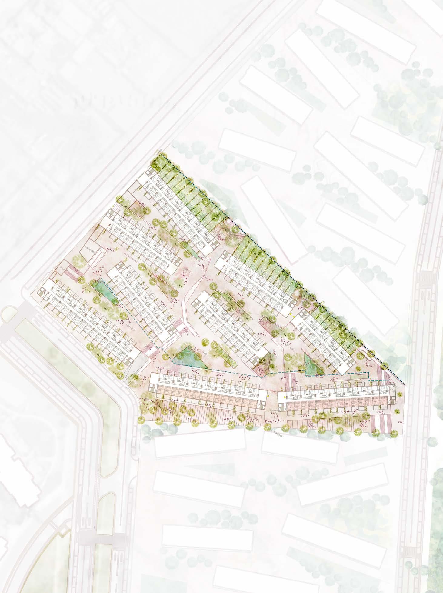 In 2021, a competition was launched for social housing development on a parcel neighboring the towers. Our proposal, an extendable system applicable to all villa parcels, reinstates the water treatment facility. We suggested supplementing primary water treatment with an artificial wetland for irrigation and recreation. The architectural design comprises incremental, sustainably-sourced wooden buildings, directing pedestrian flow towards the park and wetland.