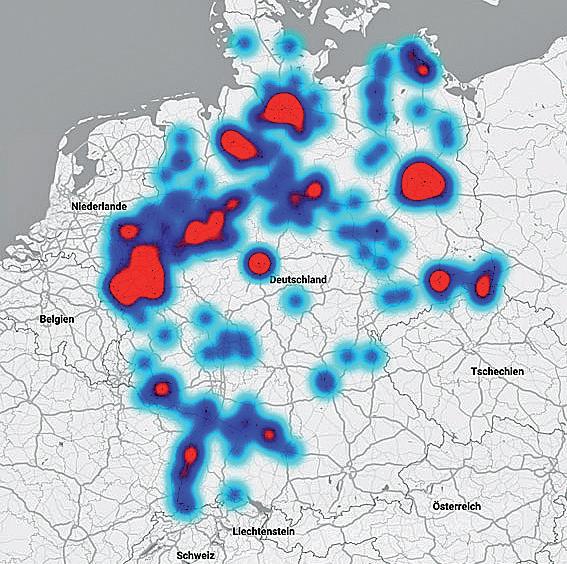 Die „Heatmap“-Diebstahlkarte von Moving Intelligence zeigt die Hotspots der Wohnmobildiebstähle in Deutschland.