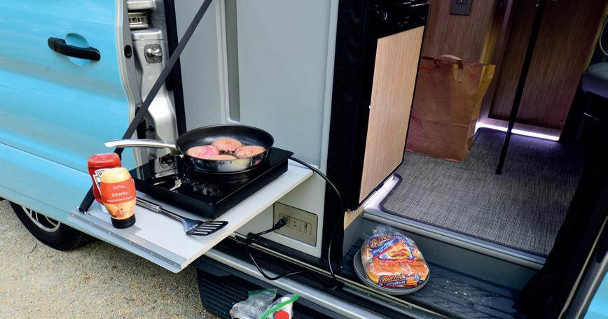 Der Herd ist eine Induktionskochplatte. Die Heizung ist eine 1.800 Watt Elektroheizung. Der Warmwasserbereiter arbeitet elektrisch. Die Klimaanlage auf dem Dach ist ein 48 Volt-Gerät. Ein Kompressor-Kühlschrank hält Lebensmittel und Getränke frisch. Alles außer der Klimaanlage läuft über den Wechselrichter, da die Batterie eine 48-Volt-Ausführung ist. Der Wechselrichter bleibt die