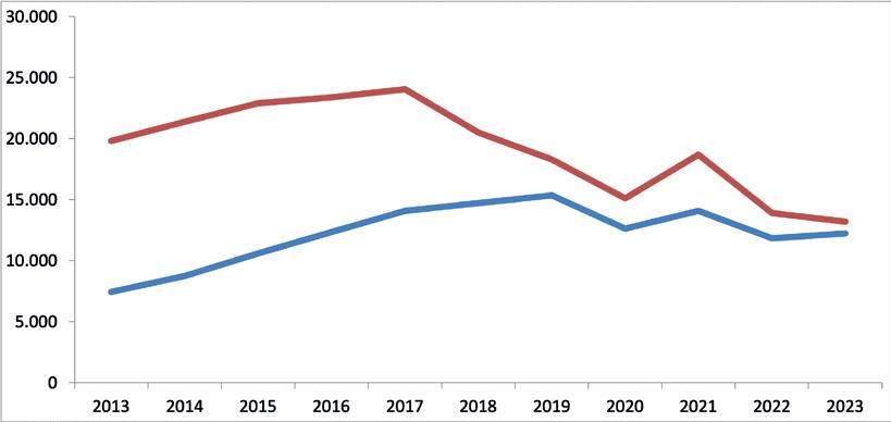 Das Caravan-Segment verzeichnete in den letzten drei Jahren einen konstanten Rückgang. Die Zulassungen gingen zwischen 2021 und 2022 um 10,1 % und 2023 um