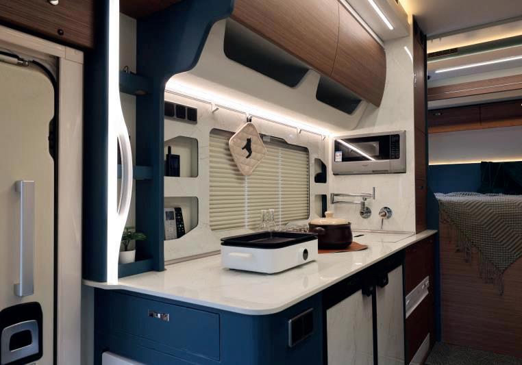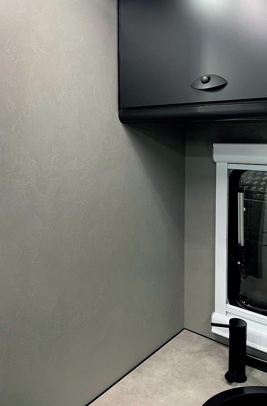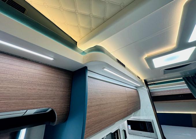 wird häufig für Verkleidungen in Campervans im gesamten Wohnbereich verwendet: zudem im hinteren Schlafbereich, für die Verkleidung über dem Fahrerhaus sowie für die seitlichen Schiebetüren und die hinteren Flügeltüren. Auch für Aufstelldächer bietet das Unternehmen eine Reihe von Optionen an. Darüber hinaus stellt es passgenaue, formschöne Verkleidungen für die Unterseiten von Wohnmobil- und Kastenwagen-Hubbetten her. AMA Composites verfügt über spezielle Systeme zur Isolierung und Beheizung der Bodenplatte. In diesem Bereich arbeitet das Unternehmen mit der italienischen Firma Palomar zusammen. Was die Heizungslösungen für den Wohnbereich betrifft, so entwickelt AMA Composites die Verwendung der leitfähigen Heizmembran JESS ständig weiter. Dabei handelt es sich um eine sehr dünne, mehrschichtige Membran, die beliebig geformt werden kann und mit Gleichstrom betrieben wird. Sie kann im Boden, in den Wänden oder der Decke verlegt werden.