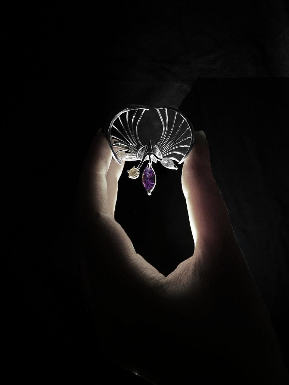 ’Soar’ is a piece that ‘reveals’ through an interactive motion and shows something never been seen before The object is completed with three gemstones that hinge to the middle of the silver decorative background. Formed out of curves into a pattern, the majestic silver background is shaped The design is accompanied by a hint of Art Deco style, with its styled geometric and symmetrical form. To break down its simplicity and to bring out contrast, textures are added to its wings as well