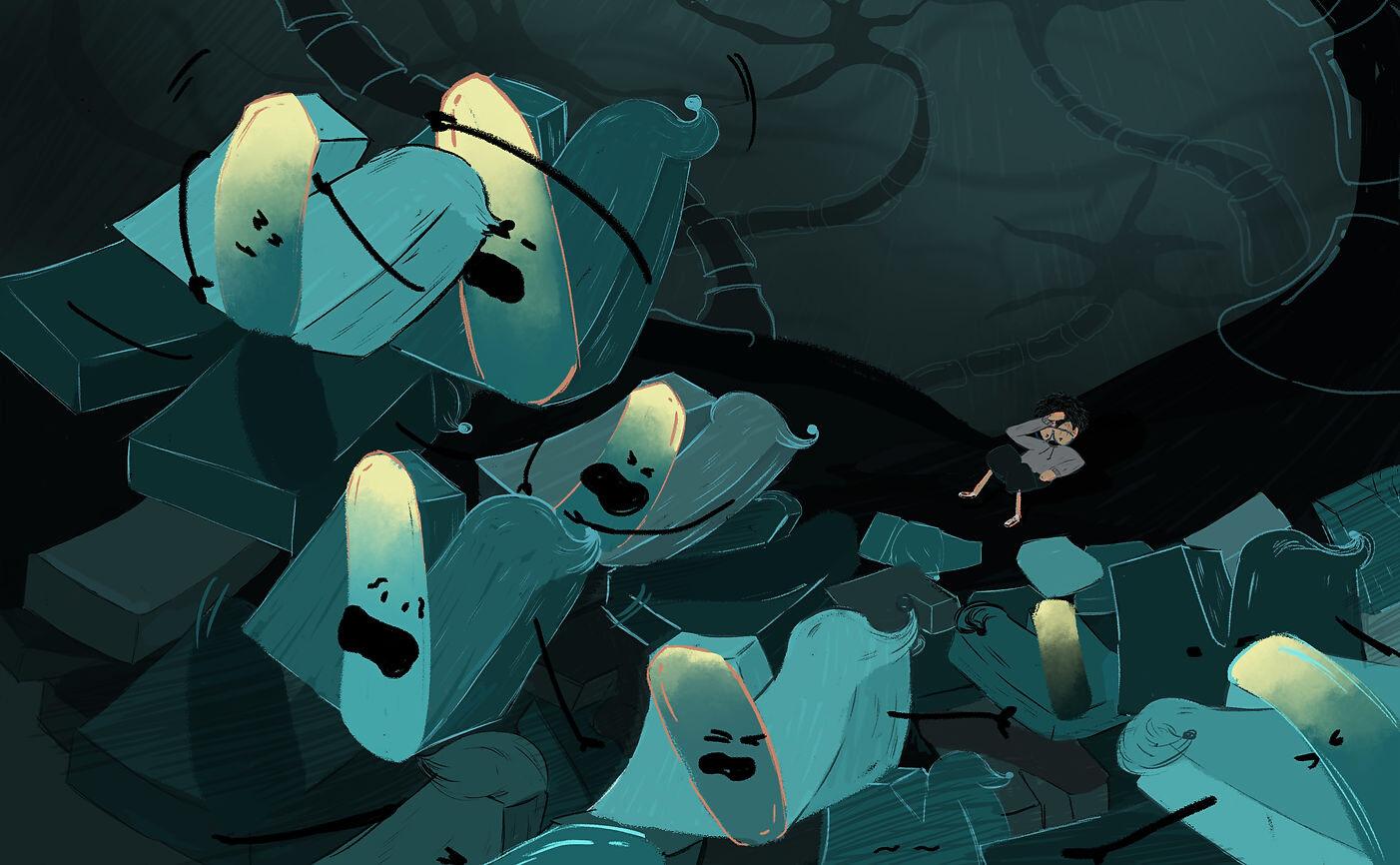 Beneath the A is a project for children age 10+ in response to the issue of stress amongst students in Singapore, especially with parental pressure The story portrays a chronically stressed student who wakes up inside his own brain and sees how stress has made a chaotic brain situation. The neurotransmitters can't function properly and he needs to find a way out to save the situation