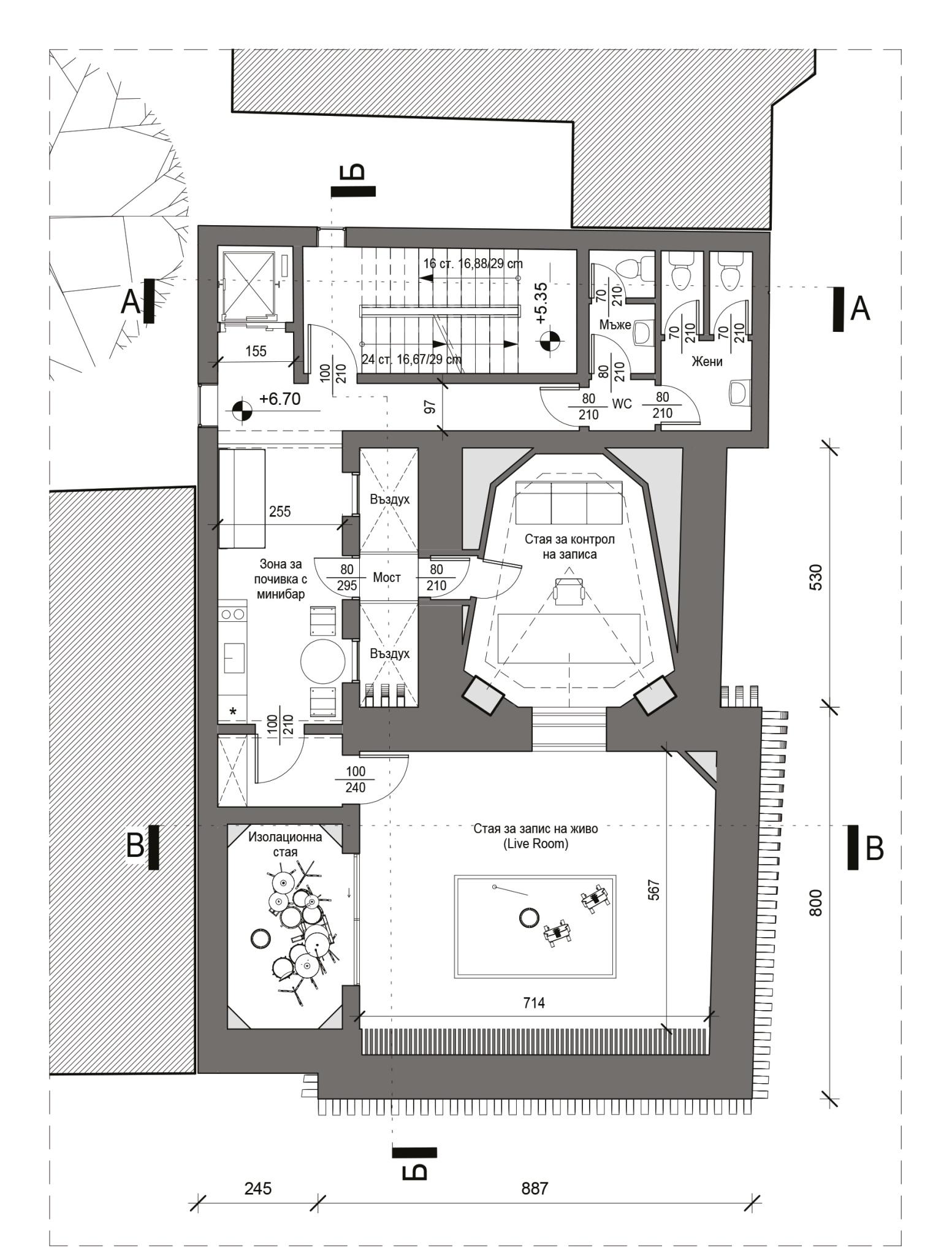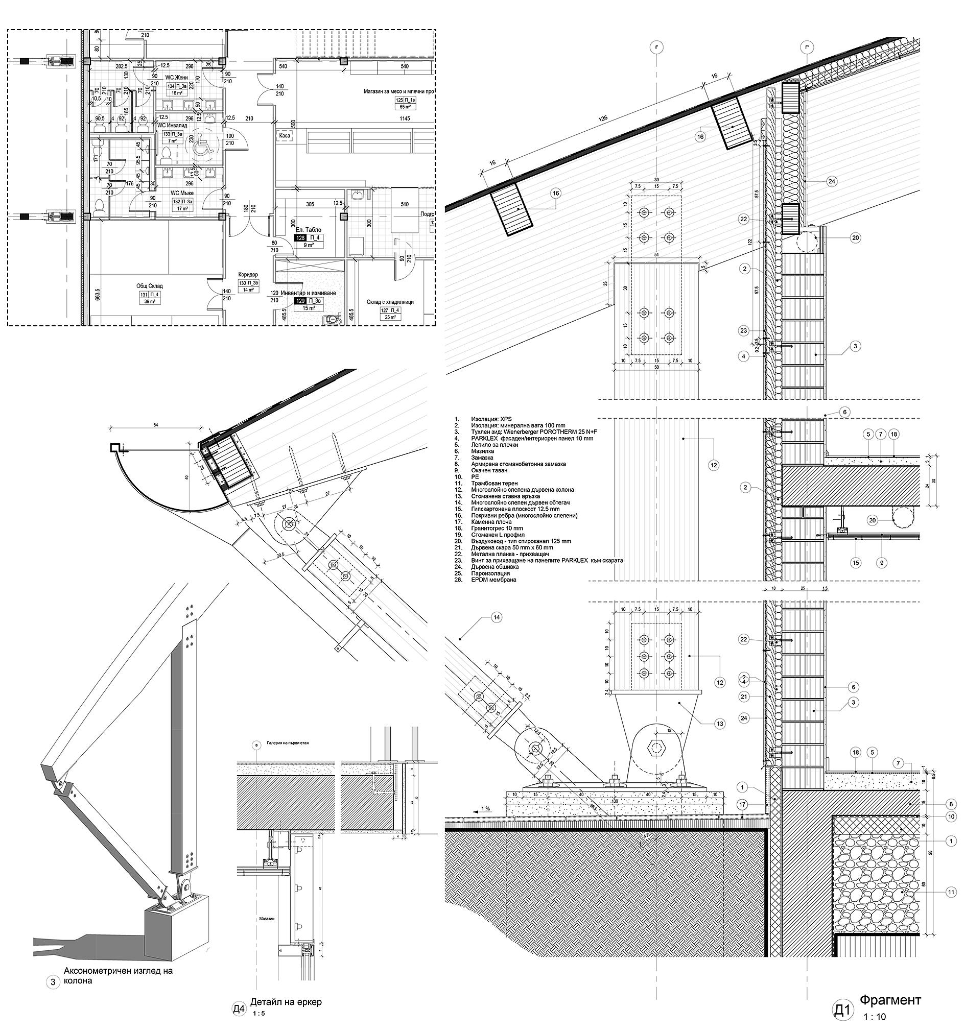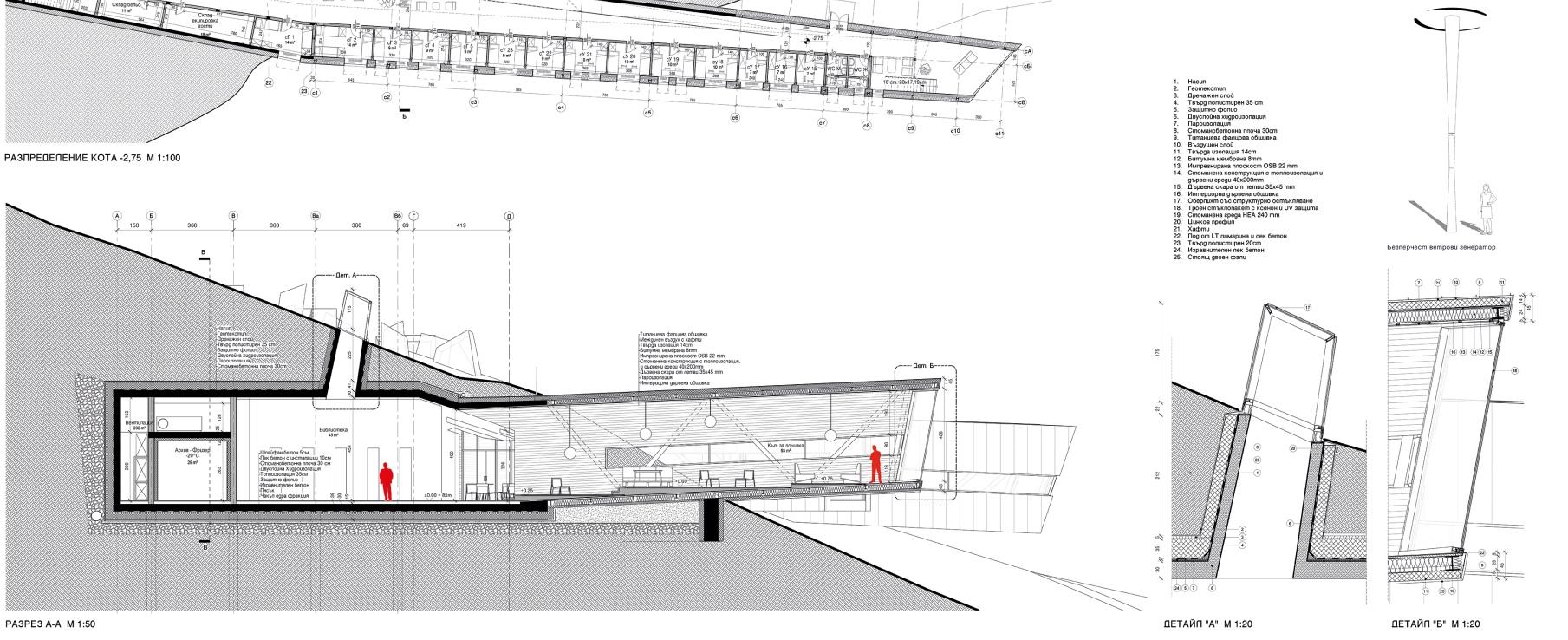 Bulgaria and the accessible use of the building. The construction is made form compound laminated wood beams which are joined together using steel planks by minimum amount of joints. The structure of the second storey floor is concrete to ensure maximum longevity of the building. The elevations are clad with wooden composite panels resistant to graffiti forming a venti‑ lated facade.