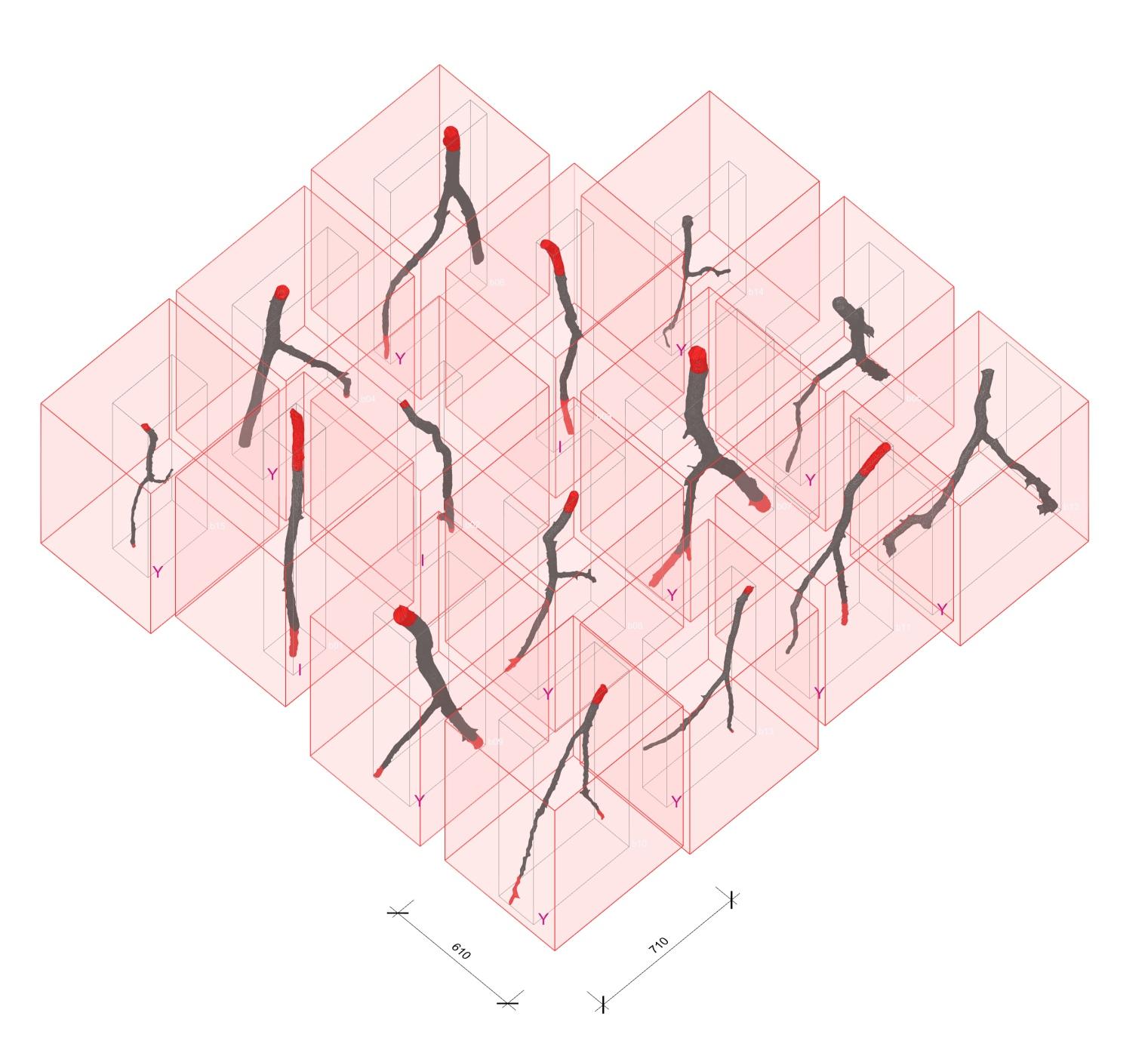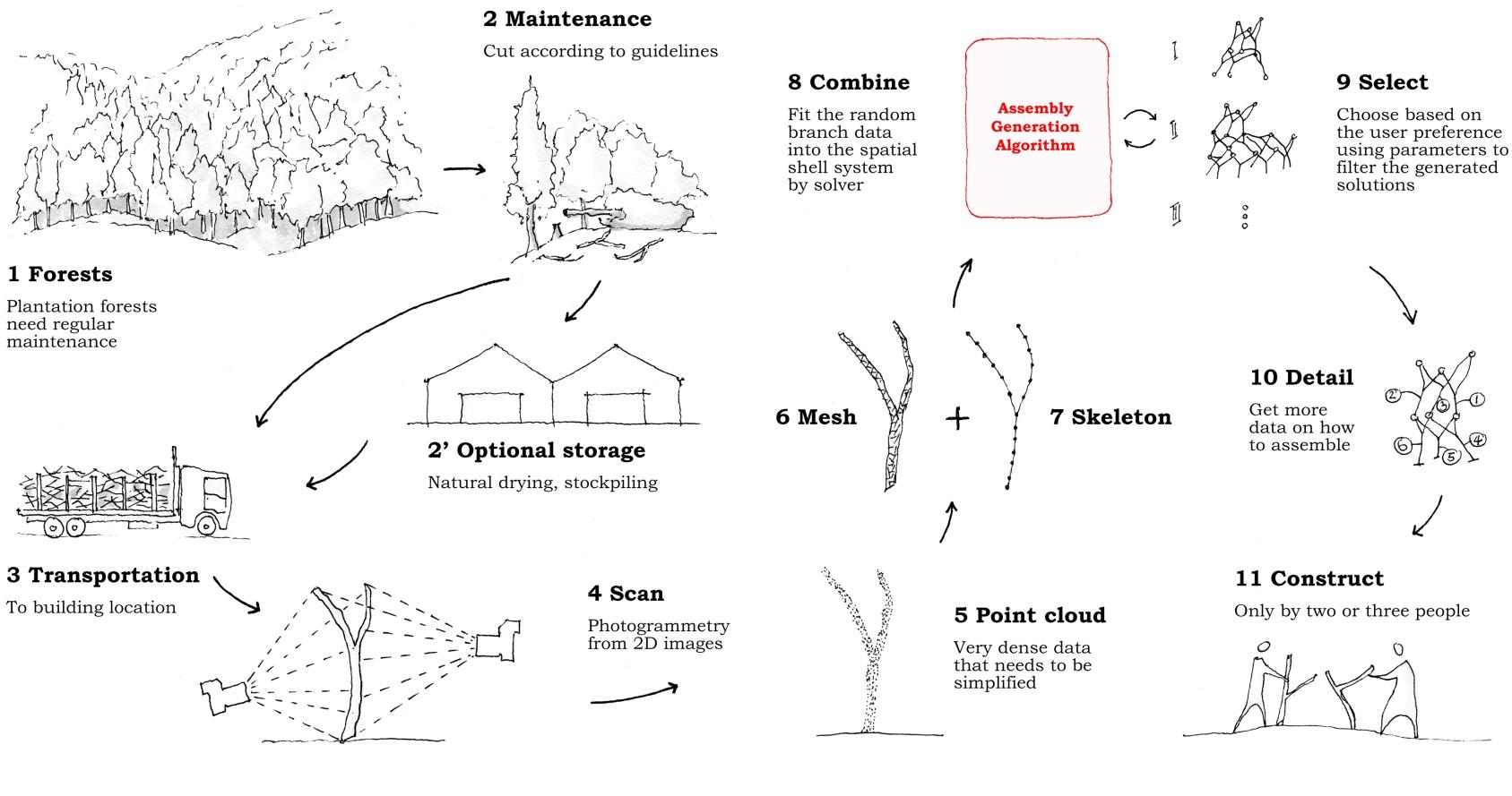 input raw materials (natural forked roundwood). The result is the world’s first constructed pavilion, following the digitally self‑formed gridshell geometry by using 15 branches connected by paper clay and metal core joints. These branches could fit in only two boxes. Ideally , by using the locally available resources, we would not need any specific transportation for the construction material with the exception of the joint materials. More details and videos of the pavilion and construction can be seen . here