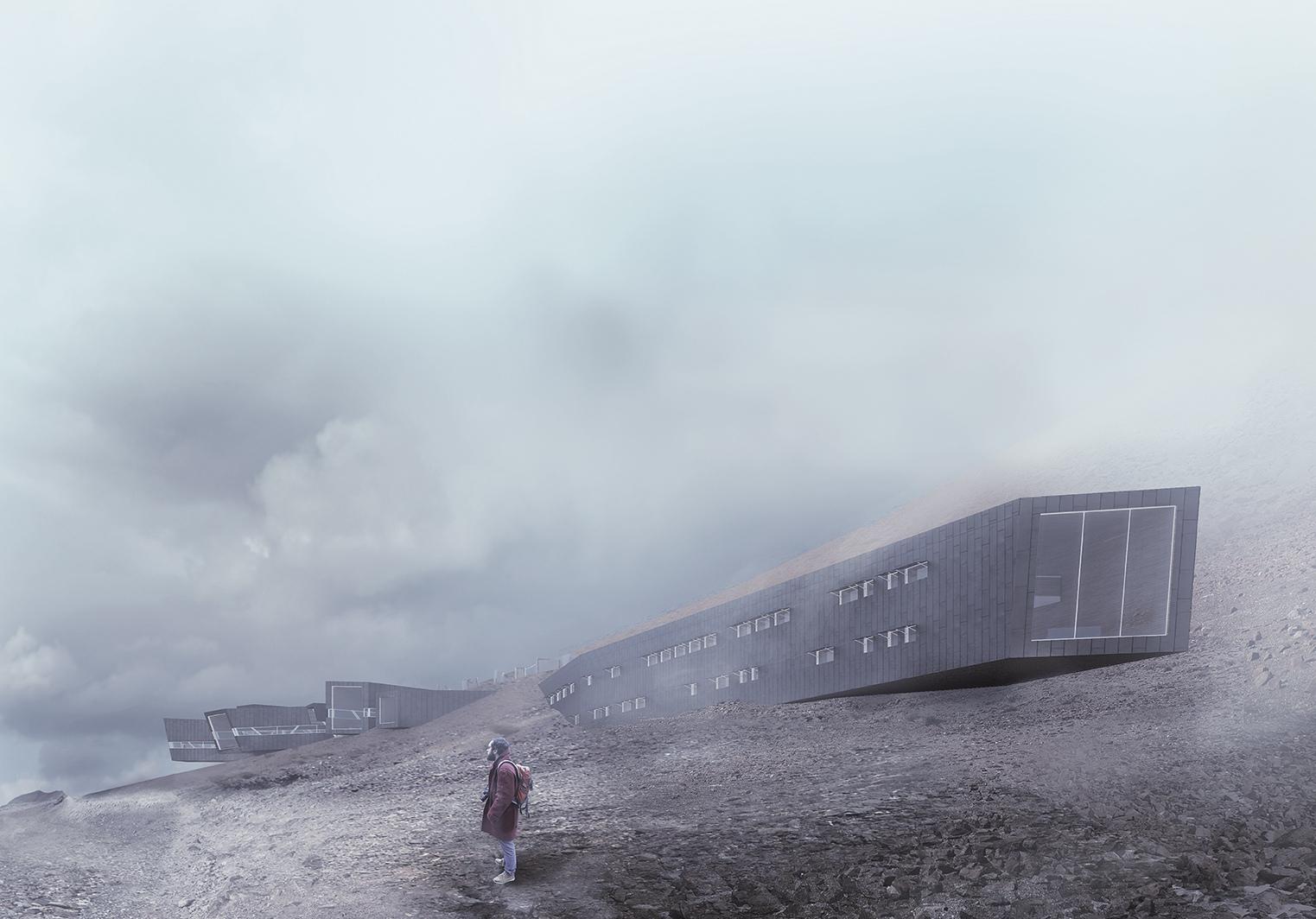 The building on the other hand is inspired by the work of the scientist as well as of the physical and physiologi‑ cal need of the humans to find shelter in this wild and alien landscape. The building uses sustainable technol‑ ogy and was designed with environmental simulation to enhance the living conditions and overcome the great challenges of spending time in isolation and irregular day/night cycles.