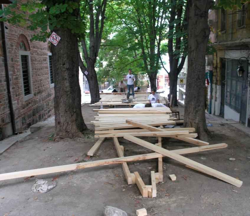 This workshop was an initiative part of the architecture days in Plovdiv . They were held in 2012 to revitalize the space behind the Djumaia mosque and three other places. A team of 14 young architects and students were gathered to do the design of the intervention and build it. As part of this team I managed to learn a lot about teamwork and working with real building materi‑ als, deadlines and manage expectations. W e designed a staircase‑like structure that could be used for sitting and small spectacles and performances.