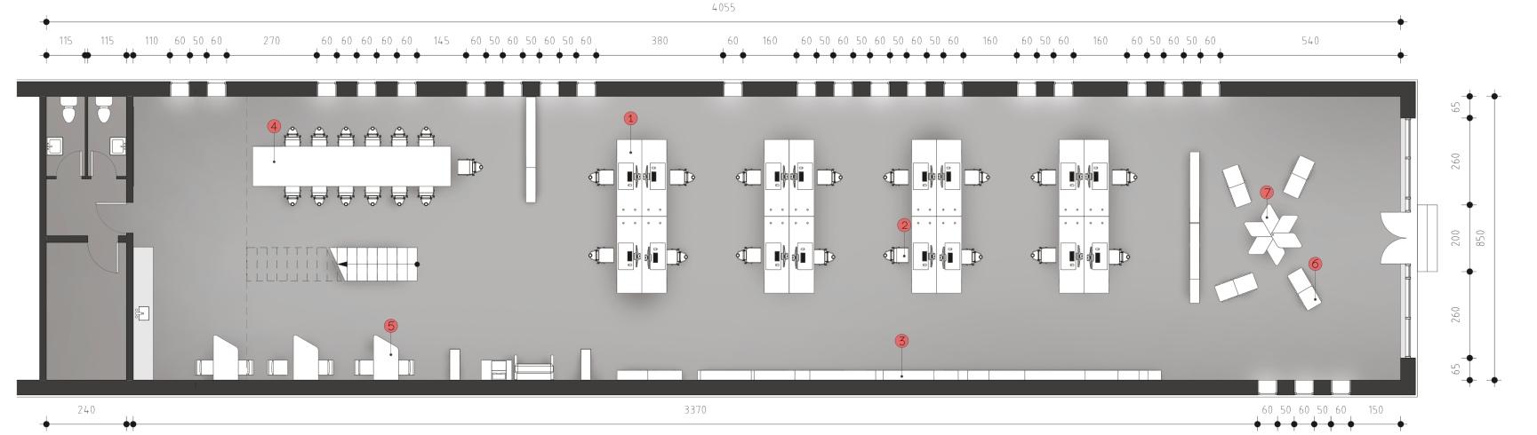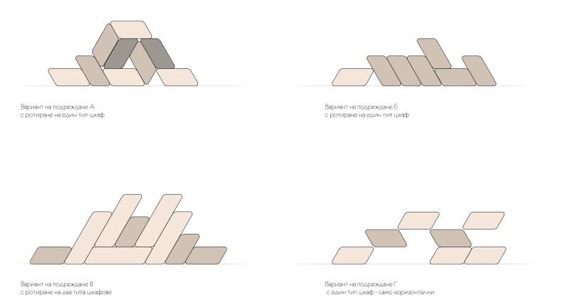 The task was to design a small to medium scale archi‑ tectural office. W e had to create all the required furniture and have some of the elements use modular o r g a n i z a t i o n p r i n c i p l e s i n t h a t c a s e t h e s h e l v e s . Everything is based on a 60 degree angle that is incor‑ porated in the basis of all the furniture. Plywood boards are the primary material used. It ensures the touch of nature as well as cost efficiency . The crumbling building that this studio is situated in was