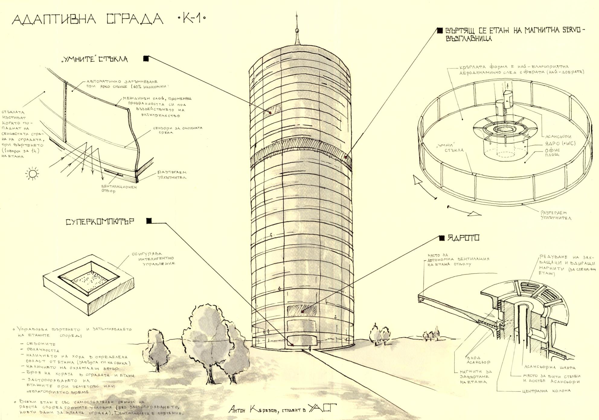 This was my first competition to enter after one year of studying architecture. Its topic was “Being adaptive at periphery ”. I chose to make a fully automated sky‑ scraper that could help his inhabitants to live or work better . Each of the floors is separated from the others and is “connected” trough magnetic fields similar to the ones that power the Maglev trains. So in this line of thought,