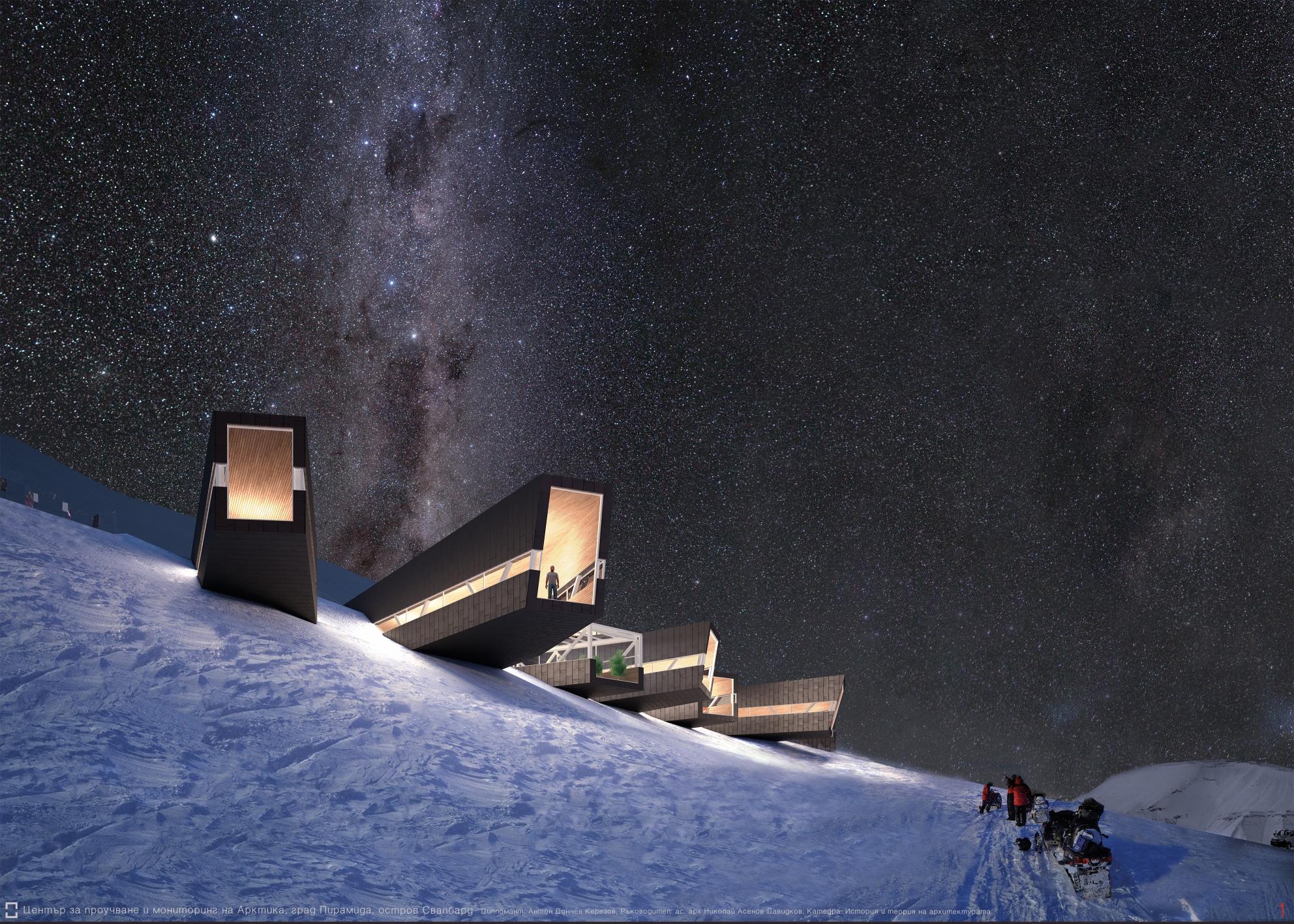 L ocated on the Svalbard archipelago in the Pyremiden city I propose this Arctic research and monitoring centre. It was inspired by the 120hours competition for the preservation of the abandoned R ussian town. The increasing global warming and its doubled effects on the Arctic as well as the shrining north ice are major factors that determine the need for the creation of such a structure at this place.