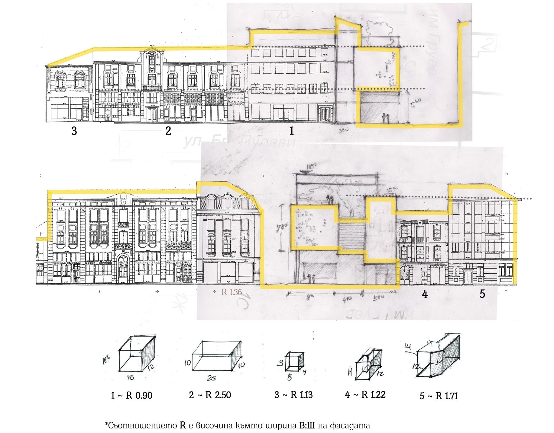 The ratio R is height to width of the facade