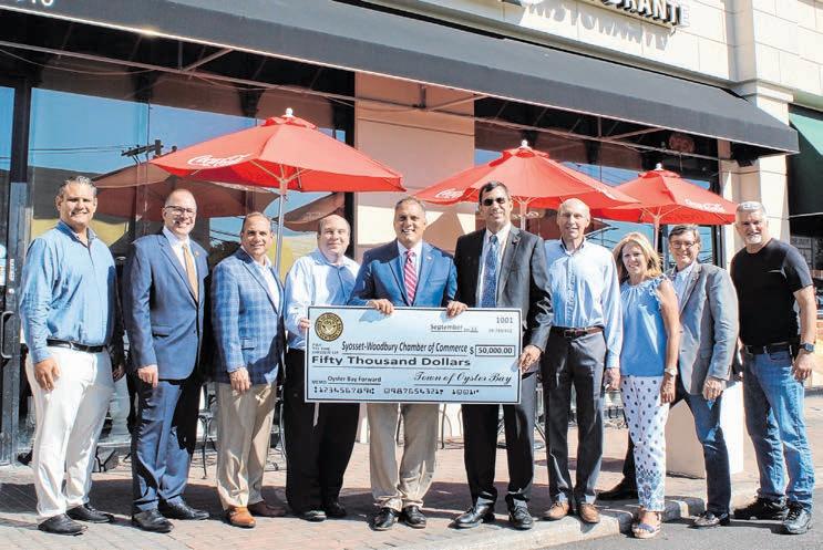Town of Oyster Bay officials recently joined with members of the SyossetWoodbury Chamber of Commerce and the Nassau Council of Chambers of Commerce to present a $50,000 grant check to the Syosset-Woodbury Chamber. The funds are part of a $600,000 grant program being administered by the town to help support local Chambers of Commerce and Business Associations that were negatively impacted by the COVID pandemic. The funding, which is being distributed to up to 12 chambers of commerce and business associations through the Nassau Council of Chambers of Commerce, is being provided through the American Rescue Plan Act and at no cost to Town taxpayers.