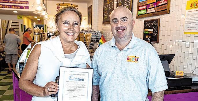 Nassau County Legislator Delia DeRiggi-Whitton (D-Glen Cove) presented a Nassau County Legislature Citation to Smusht owner Stephen Edelson on Friday, July 14 in celebration of the shop’s recent grand opening. (Photo is by Peter M. Budraitis)
