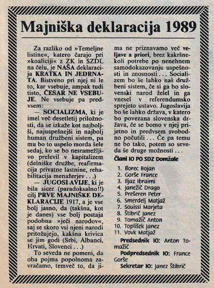 še kdo drug v Sloveniji na kak predvolilni letak tako precizno in poudarjeno zahteval njeno samostojnost, kot sem to storil jaz. Čez ves letak (s fotografijami in biografijami nas kandidatov) so bile natisnjene besede: »ZA SAMOSTOJNO SLOVENIJO« (spomladi 1990 je bilo to v izrecnem nasprotju z jugoslovansko zakonodajo), besedilo pod mojo sliko pa: »V skupščini se bom zavzemal za to, da Slovenija z odcepitvijo od Jugoslavije doseže popolno samostojnost, vključno z lastnim denarjem, in lastno slovensko vojsko. Predlagal bom spremembo Zakona o političnem združevanju, tako da se bo skrajšal rok, do katerega morajo politične organizacije (Zveza komunistov) umakniti svoje organizacije iz podjetij – na 8 dni po spremembi zakona.« To tudi v vednost socialistom, ki so si veliko kasneje izmislili, da so oni dali pobudo za osamosvojitev…
