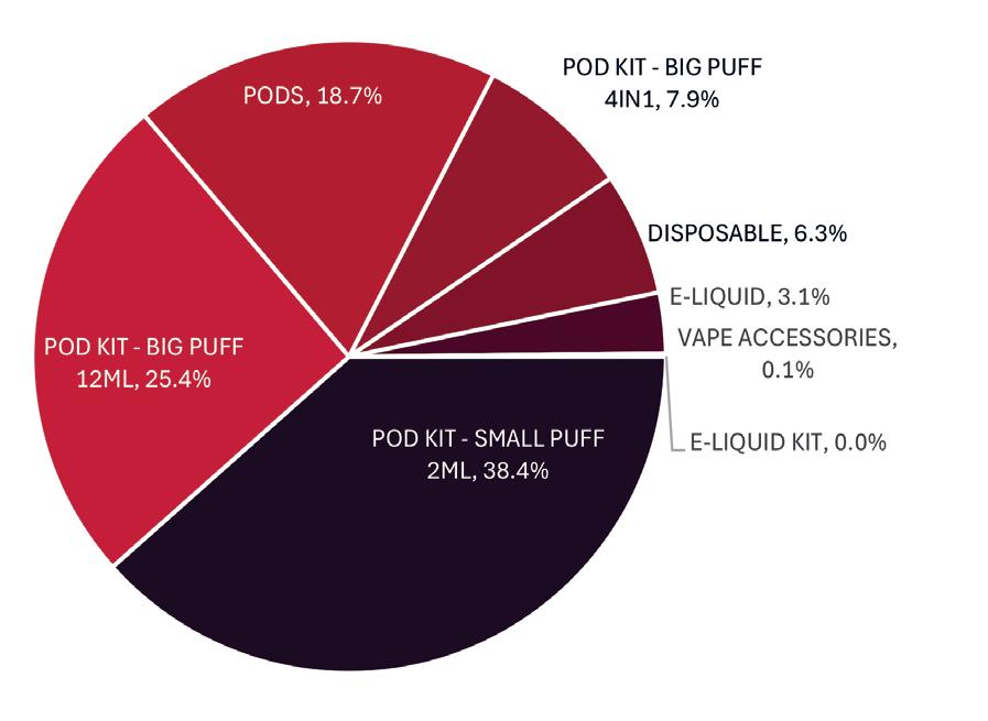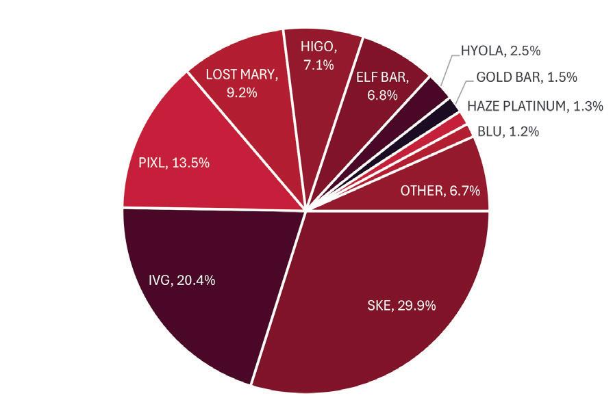 El ar and Lost Mary recently launched reusable versions of their most popular singleuse devices. e El ar 600 Pre lled Pod Kit has replaced the El ar 600 and the Lost Mary BM600 Pre lled Pod Kit succeeds the BM600. Both are rechargeable and use pre lled pods. e Lost Mary BM6000, a reusable device that the rm claims has quickly become a best-seller in the high pu count category, has also been updated to meet new regulations. “With Circana sales data showing demand for high pu count devices continues to grow, the refreshed version ensures retailers have continued access to one of the category’s strongest performers,” says Angelo Yang, Associate General Manager, UK, El ar. While some big vape brands have been wounded by the single-use ban, a number of newer brands have shot through the ranks. Pixl, which only launched in June 2024, enjoyed o -the-chart growth to become the third-topselling vape brand with an impressive 13.5% share, while Higo rocketed 238% to h place with a 7.1% share.