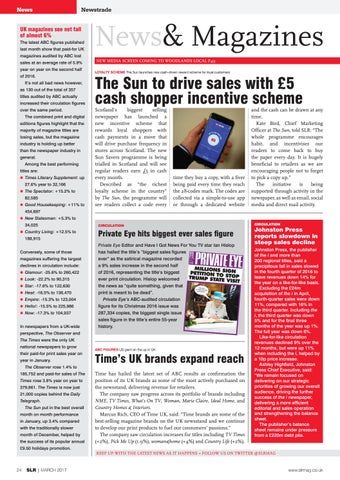 perspective, The Observer and The Times were the only UK national newspapers to grow their paid-for print sales year on year in January. The Observer rose 1.4% to 185,752 and paid-for sales of The Times rose 3.8% year on year to 379,861. The Times is now just 21,000 copies behind the Daily Telegraph. The Sun put in the best overall month on month performance in January, up 3.4% compared with the traditionally slower month of December, helped by the success of its popular annual