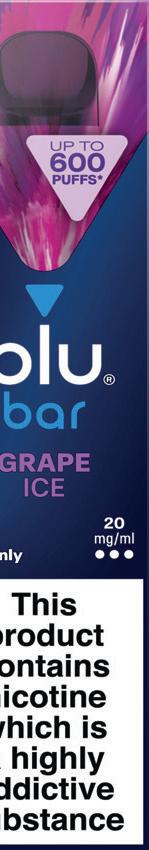 Now available in six avours, “carefully chosen due to their consumer appeal,” each blu bar device contains 20mg/ml of nicotine, in 2ml of e-liquid, providing adult vapers with up to 600 pu s.