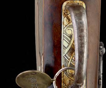The gold bubri or tiger stripe design is associated only with Tipu (Tipoo) Sultan himself, weapons for his own personal use and selected weapons in his armoury. Known as the the Tiger of Mysore, Tipu had once stated that it is better to live one day as a tiger than a thousand years as a sheep. Feared and hated by the British, Tipu Sultan had been portrayed as a cruel and violent man and oppressor. However he was loved and revered by many in India as an ambitious, courageous and innovative leader. Unlike his father who had come from humble origins and was illiterate, Tipu was a highly educated man with a library of around 2000 works, many of which he had commissioned himself, and had a great love of firearms and the mechanical invention. He employed European weapon makers to come to India and work for him, particularly French gunmakers largely due to his good relations with the French. They not only made weapons for him, but also instructed his own craftsmen in the European tradition. His weapons were particularly advanced for the day, including flintlock repeating mechanisms based on the systems developed by Italian maker Lorenzoni. He finetuned the rockets designed by his father Haidar Ali, using the superior quality hammered iron in Mysore to create advanced and highly effective weapons that inflicted many significant losses on the British troops during the four Anglo-Mysore Wars.