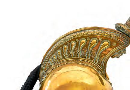 613. A GOOD SCARCE GENTLEMAN AT ARMS HELMET the gilt skull with applied gilt mounts to include ornate pierced acanthus scroll, laurel, oak leaf and acorn trim, the helmet plate with central Royal arms, HONI SOI QUI MAL Y PENSE in garter surround on a white metal faceted rayed star, surmounted by a King’s crown, the whole on a stippled plate within an acanthus border and with an oak leaf and acorn wreath in surround, velvet backed chin scales with lion’s paws clasp and large lion bask bosses, quilted lining, complete with its swan feather plume. The inside of the neck guard incised in the green leather lining FHL. £2,000-3,000
