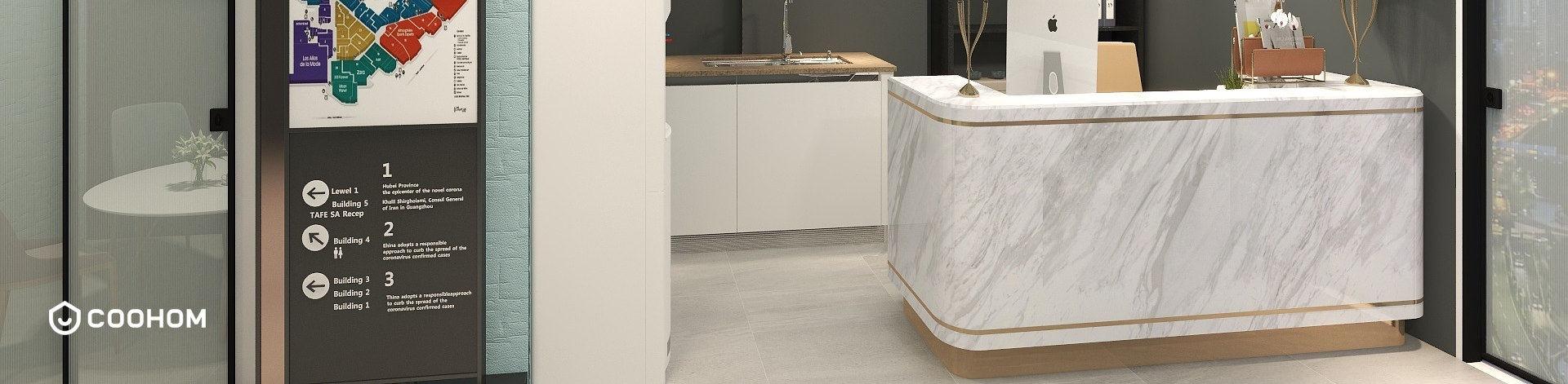 The entrance opens into a spacious reception that features minimalist furniture, clean surfaces, and unobstructed views. Seating is arranged in a simple, modular style, with sleek, lowprofile chairs and small side tables that keep the space feeling open and uncluttered.