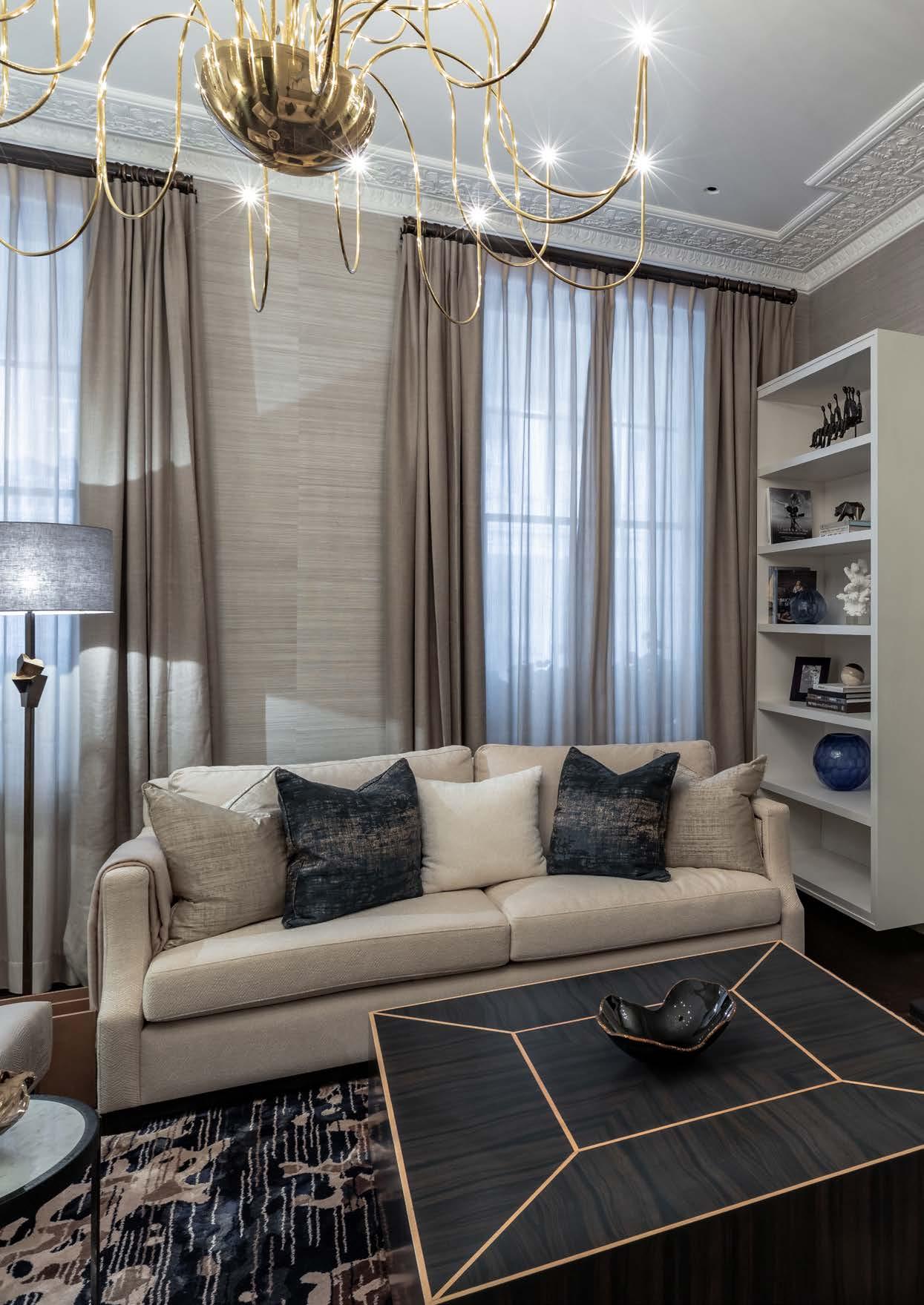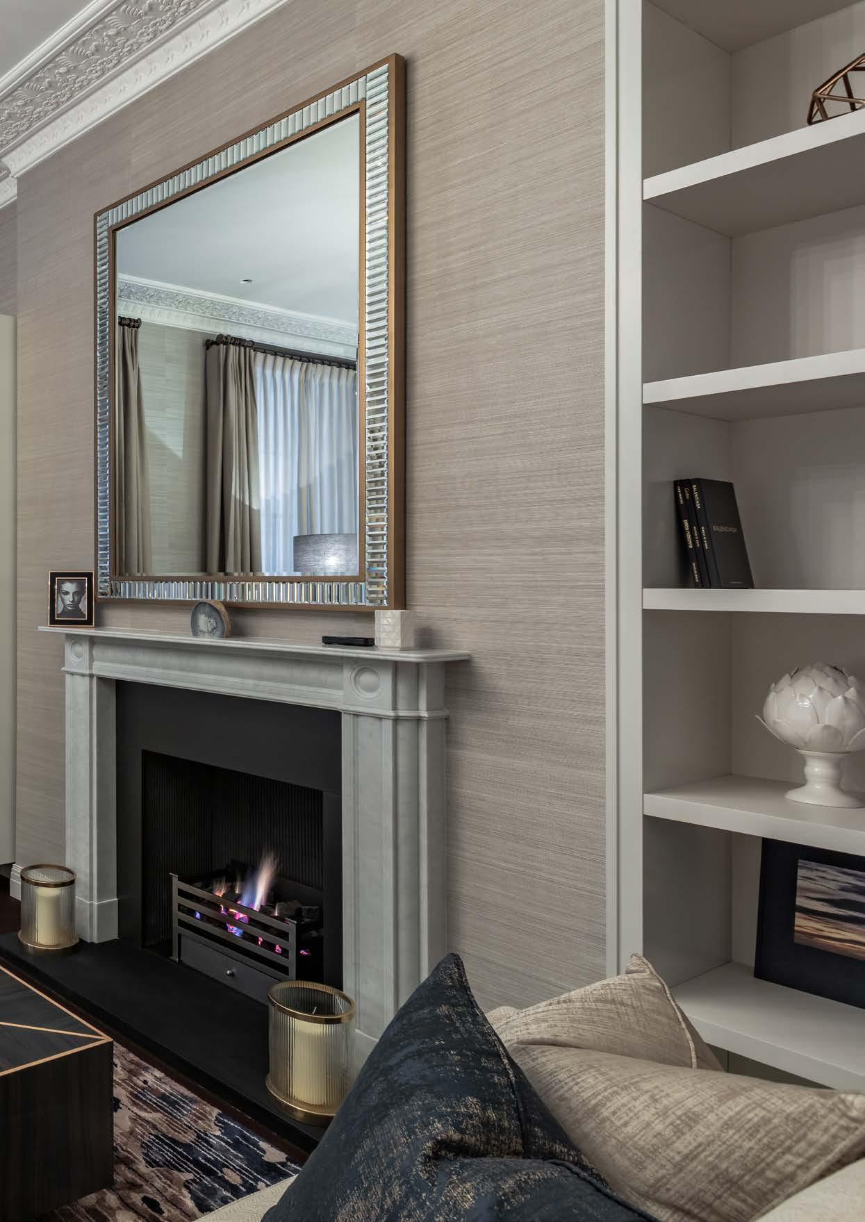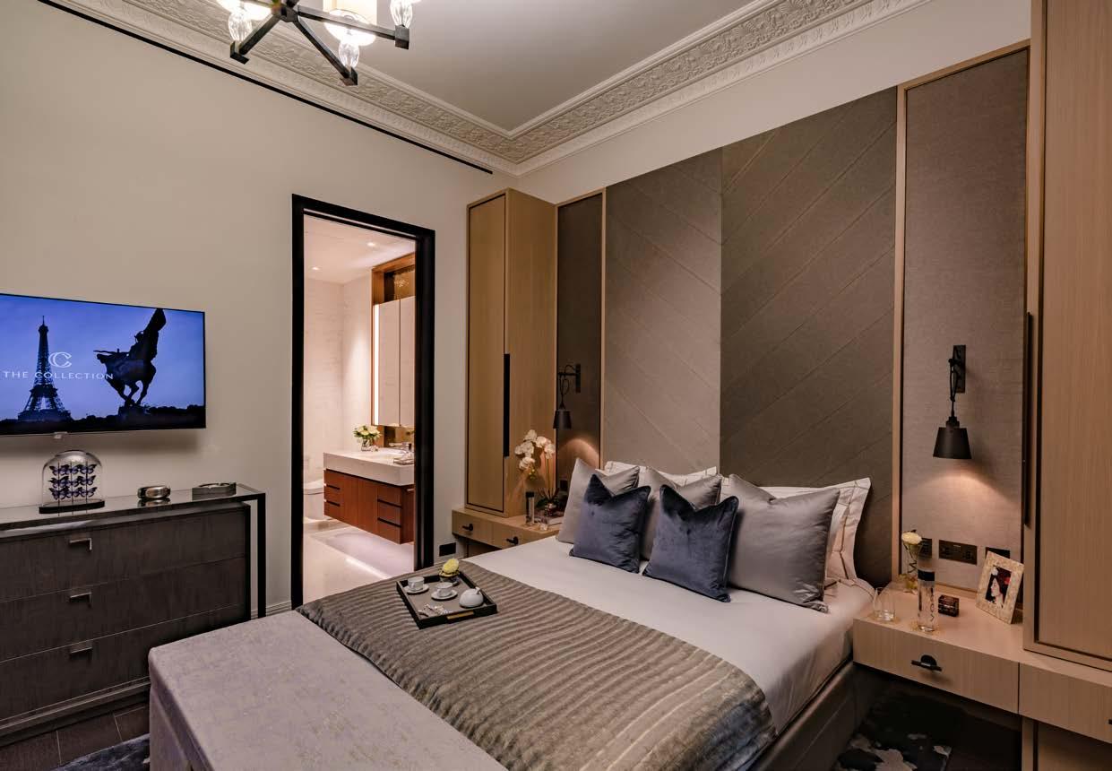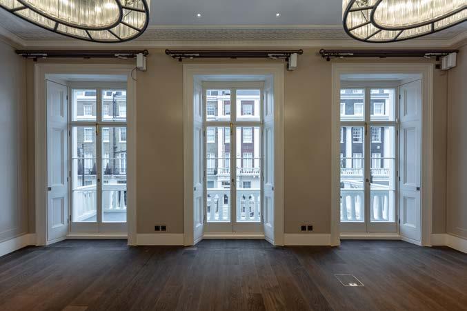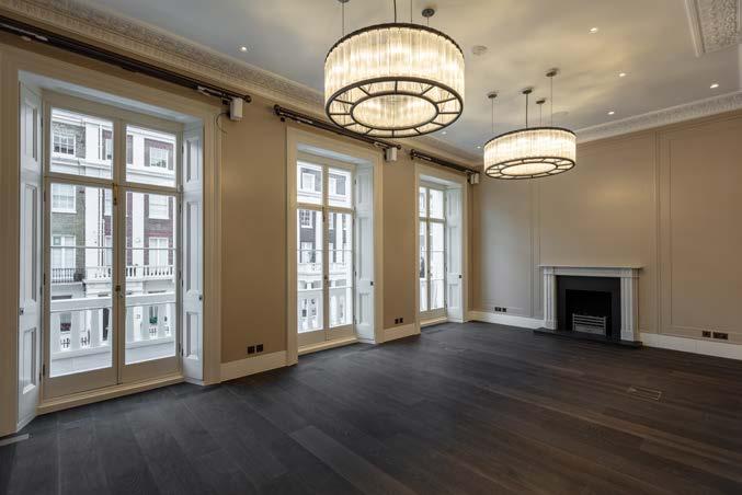 The residences have spacious reception rooms with large dining areas all with fumed and stained oak parquet floorings, bronze finished switches and ironmongery. All living rooms have floor boxes for housing electric and data plugs to enable a variety of furniture arrangements. Living spaces feature remote-controlled modern gas fireplace with limestone finish. In each apartment, doors with fire resistant specification, are manufactured with traditional details. Formal reception and dining room walls are covered with lacquered wood panelling whereas bedroom walls are finished with silk wallpapers. All skirting, corniches and roses in the rooms are restored and painted to their original state.