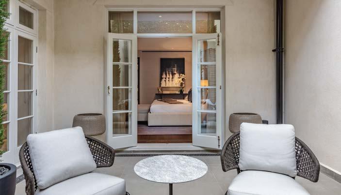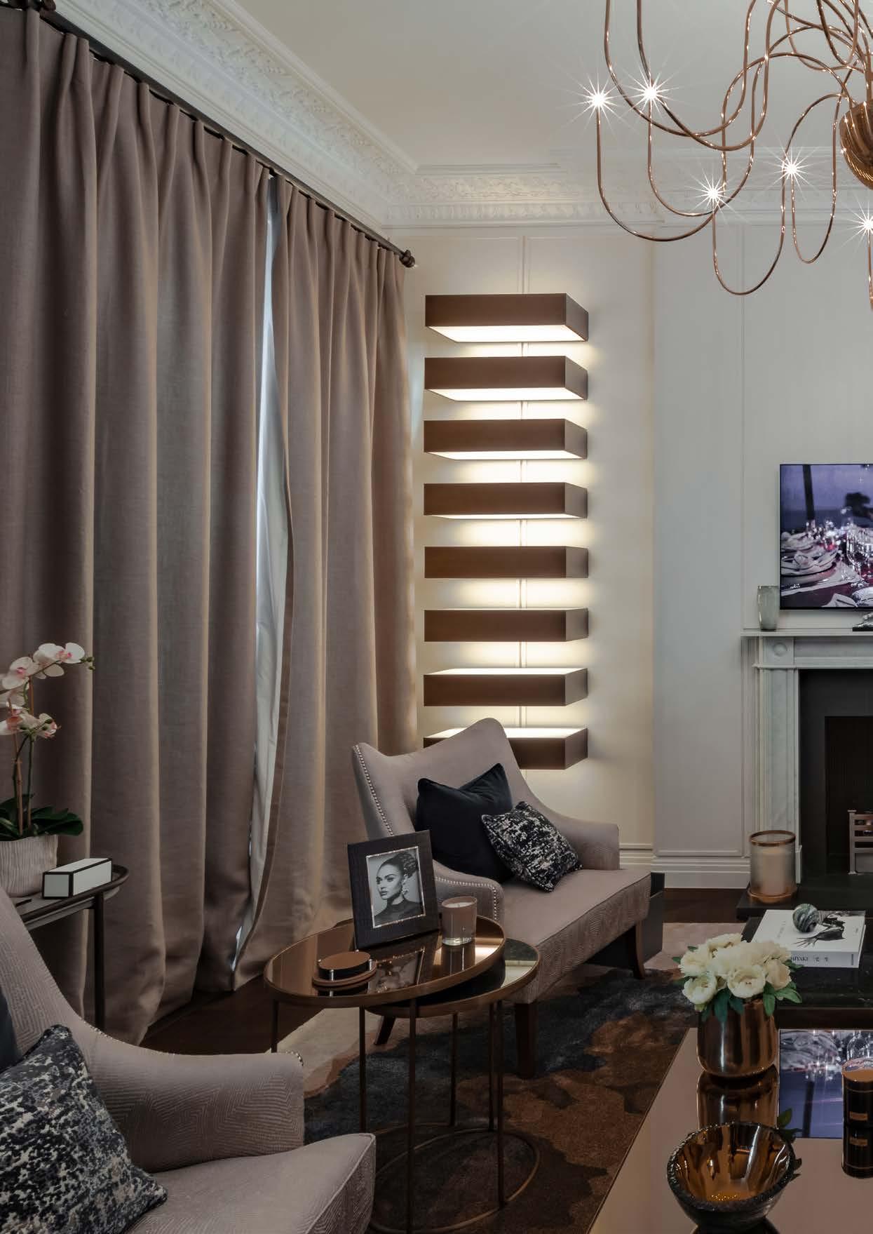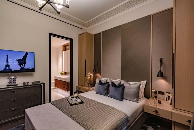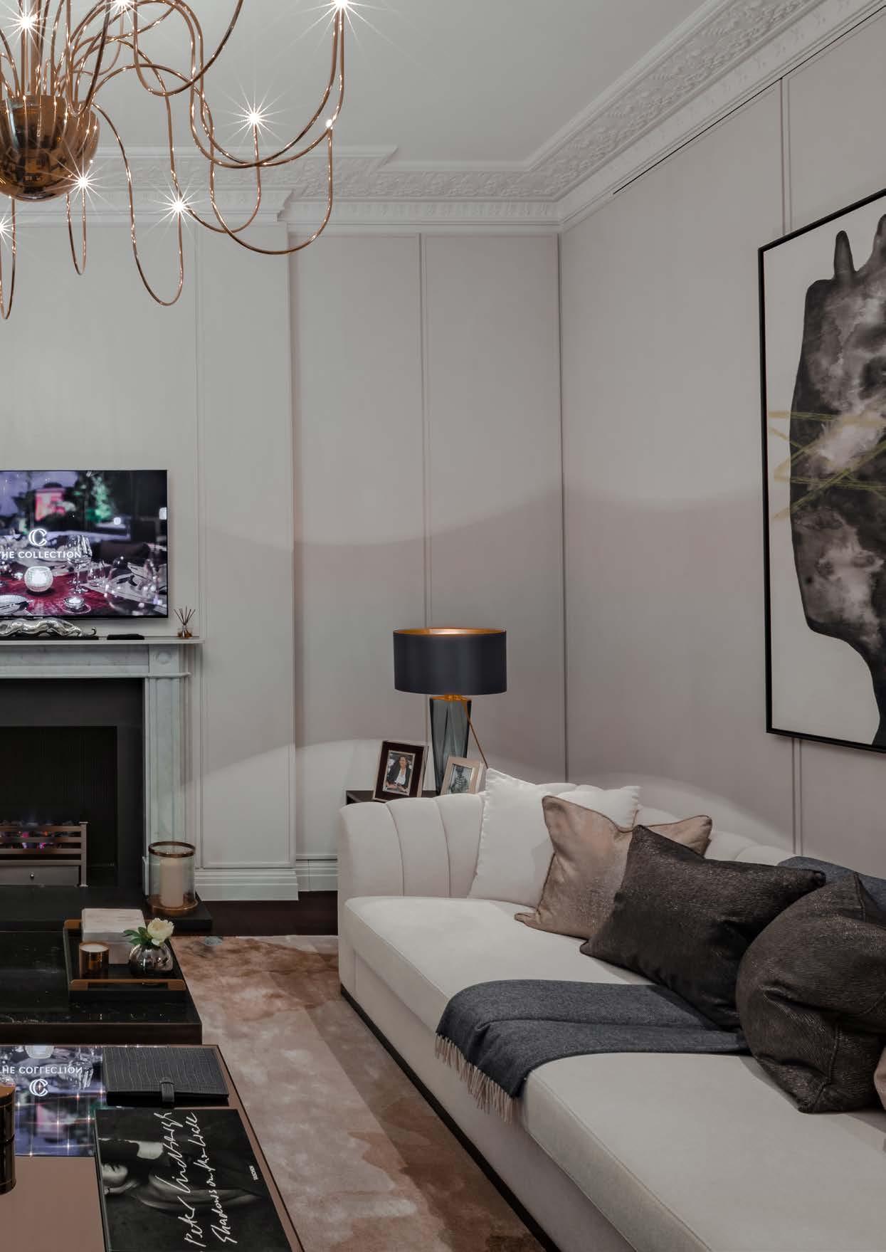 The residences have spacious reception rooms with large dining areas all with fumed and stained oak parquet floorings, bronze finished switches and ironmongery. All living rooms have floor boxes for housing electric and data plugs to enable a variety of furniture arrangements. Living spaces feature remote-controlled modern gas fireplace with limestone finish. In each apartment, doors with fire resistant specification, are manufactured with traditional details. Formal reception and dining room walls are covered with lacquered wood panelling whereas bedroom walls are finished with silk wallpapers. All skirting, corniches and roses in the rooms are restored and painted to their original state.