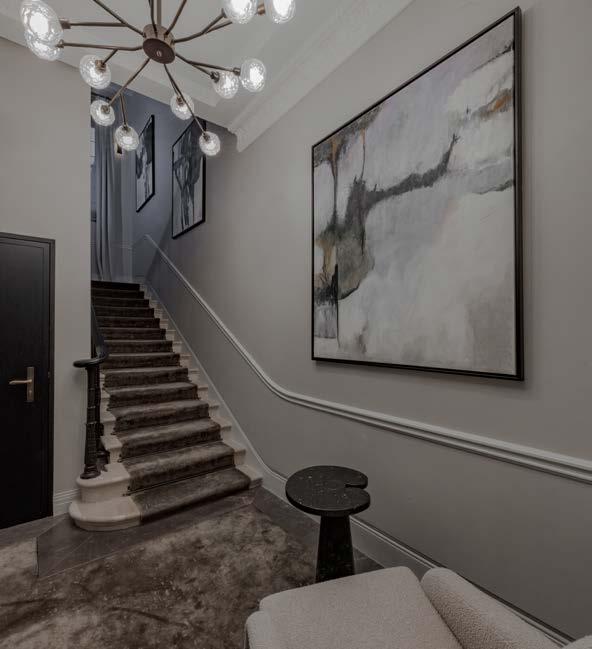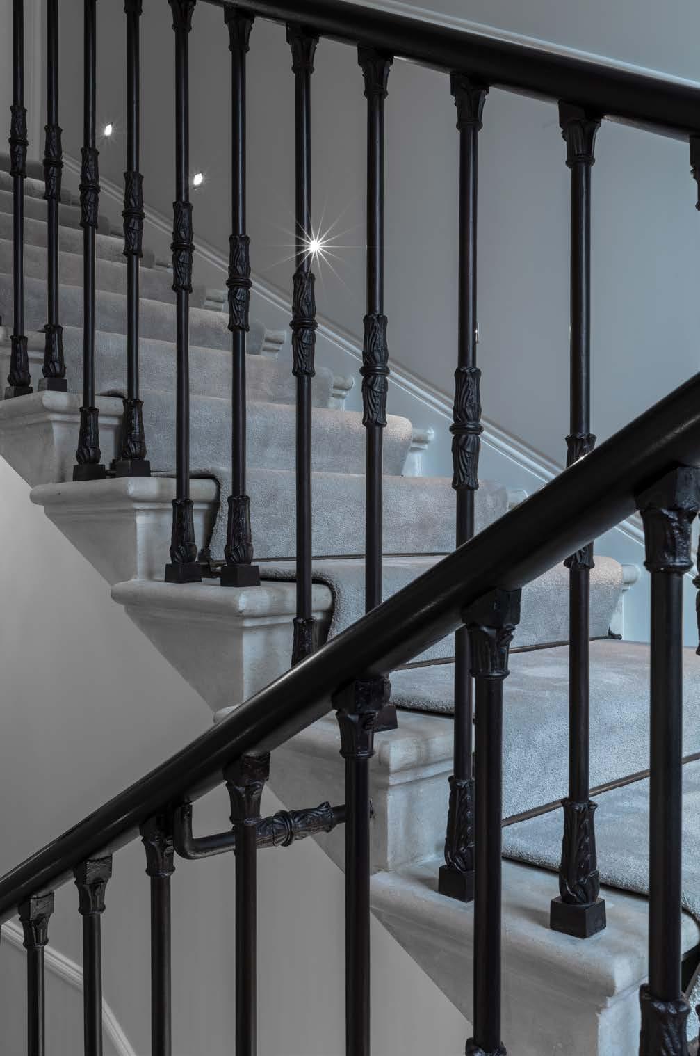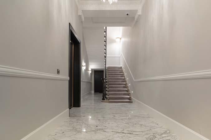 Restoration of the main staircases had been completed by repairing the stone steps, the spindle and applying French polishing on the existing hand rails diligently. All corniches, roses and skirting in the rooms have been restored and missing pieces are replicated. All wooden shutters in windows are restored and painted and their original brass braces and hinges have been restored. The foyers of 22 Eaton Place has vein and bookmatch Arabescato Marble installed.