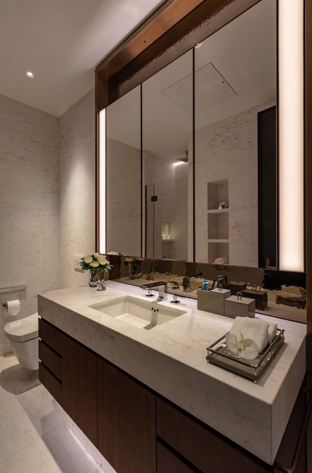 Vein matched Venatino White marble used as the wall and floor coverings of the master bathrooms whereas Sivec 45 marble is applied in all secondary bathrooms in all residences in 20-22 Eaton Place. Bathroom vanities are finished with Nublado marble countertops and walnut timber frames and drawers. Master bathroom vanity is featured with a bronze frame and a bronze patterned mirror on the wall of the bathtub in 20 Eaton Place. However 22 Eaton Place features Sahara Noir marble slabs on the floor, calacatto gold marble slabs on the walls and bespoke Sahara Noir marble on the bathroom vanities.