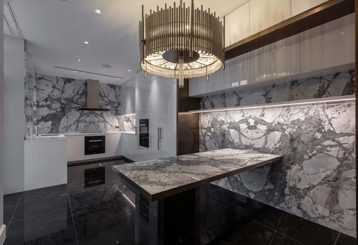 Apartment one, located on 22 Eaton Place features, in contrast, iceberg marble slabs across the walls, and the dining table giving the kitchen a brighter look compare to other kitchens. Belgium black marbles are installed on the floor.