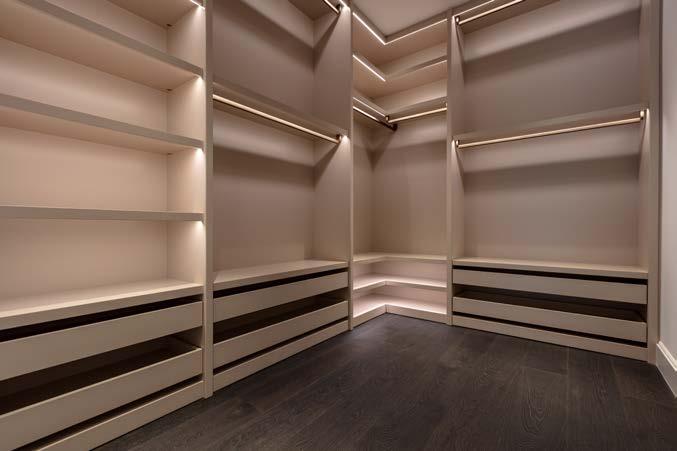 All bedrooms are fitted with dressing rooms and large walk-in closets with bleached walnut scupira shelves lit by linear LED lighting fixtures. Floors are covered with fumed and stained oak parquet.