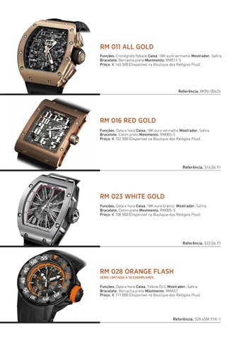 Funções. Cronógrafo flyback Caixa. 18K ouro vermelho Mostrador. Safira Bracelete. Borracha preta Movimento. RM011-S Preço. € 165 500 (Disponível na Boutique dos Relógios Plus)