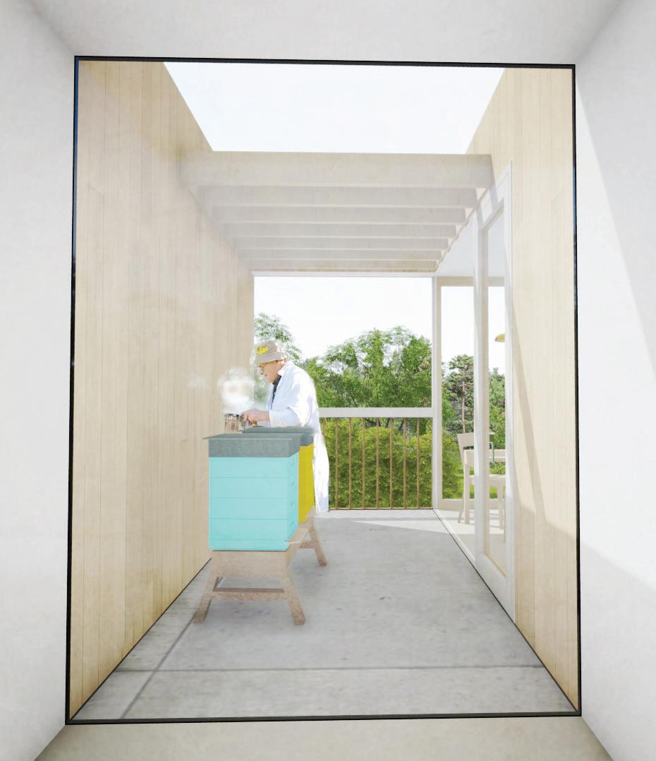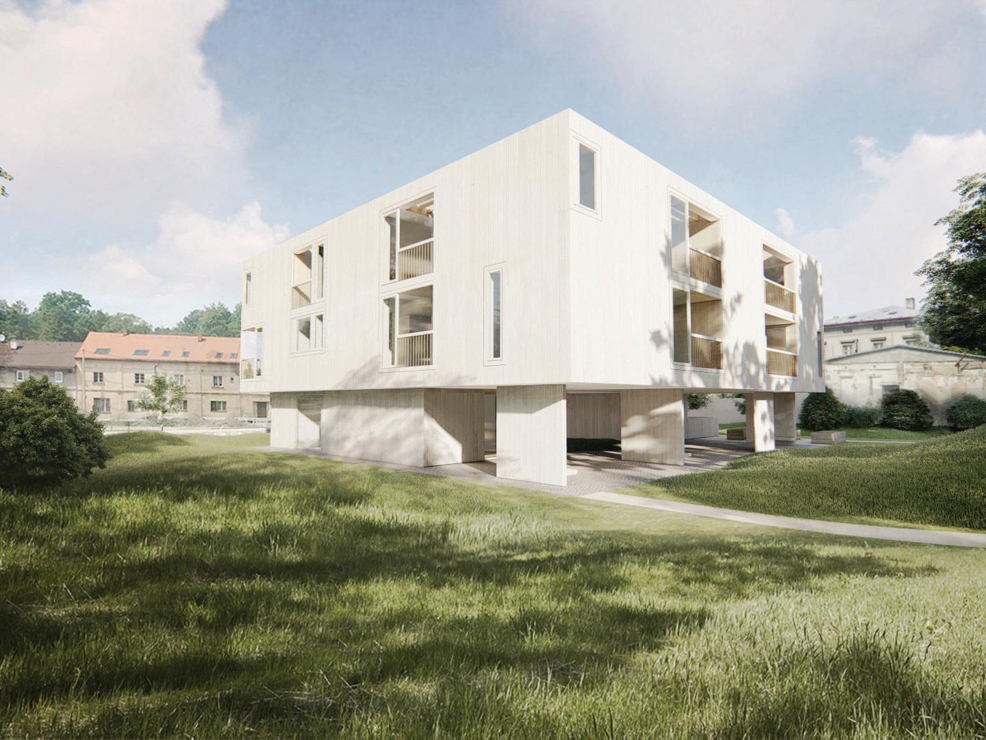 Všechny ostatní byty, jsou umístěny ve vyšších patrech, zejména kvůli klidu a pocitu bezpečí obyvatel. Motiv individuality nás přiměl vytvořit většinu samostatných “garsonek”, které však přes pobídku upraveného zadání jsou plně soběstačné, včetně možnosti kuchyně či pračky. Silně vnímáme intimitu úplně všedního bytí. Nechceme obyvatele KODUSU připravit o možnost sám si u sebe doma uvařit nebo vyprat, dívat se na televizi, klidně být pár dní jenom sám doma. Komunitní život si představujeme jako využitelnou nadstavbu, a mnohdy, třeba časem, vítanou alternativu, ale ne jako povinnost. Sdílení považujeme za volbu - za možnost něco přinášet i se spolehnout. V návrhu jsme však vyzkoušeli i model dvoupokojového bytu se společným prostorem kuchyně a obývacího pokoje. Umístili jsme deset jednobytů a tři dvoubyty, předpokládaná kapacita je 16 obyvatel. Jednobyty mají podlahovou plochu 30 m2, tři dvoubyty pro blízké přátele či dokonce pár mají plochu 55 m2. Ke každému bytu náleží venkovní prostor drobné lodžie, kterou může uživatel bytu používat podle vlastního uvážení. Lodžie opticky navazují na vnitřní ochozy ve dvou vyšších patrech, některé byty jsou vlastně ve vile ukryté malé domky se zahrádkou. Výše zmíněný “kruh” není pevně semknutý, jeho energie se na všechny strany různě otevírá a zavírá, je to spíš kruhový tanec. V severní části obrácené k řece se ochozy v patrech rozšiřují na společné prostory - ve druhém podlaží kuchyně s jídelnou, “pračkárnou” a kabinetem pečovatelky, ve třetím podlaží otevřeným balkónem s propustnou pergolou, vybaveným širokým záhonem. “Mám prádlo v pračce a dobrou buchtu v troubě, piju kafe a čekám, kdo se ukáže.”
