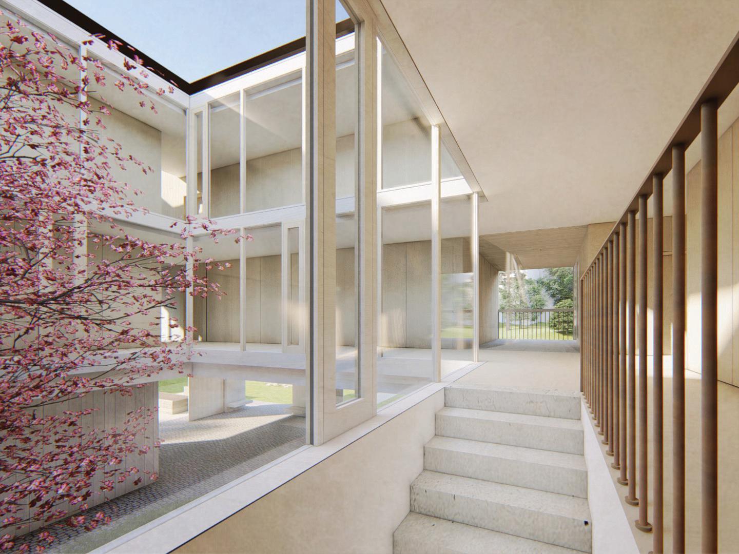 Motiv komunity a její identity nás rychle myšlenkově vedl k jednomu na venek kompaktnímu objemu, který se uvnitř chová jako “kruh” - když je to čtverec - spolu se držících přátel. Středové atrium, do kterého všichni vidí, kdykoliv vyjdou ze svého bytu symbolizuje společnou energii, kterou společenstvo obyvatel vytváří. Všechny horizontální vnitřní komunikace domu jsou ochozy tohoto atria - vlastně pavlače. Jsou to pěkně prosvětlená, vzdušná místa k setkání.