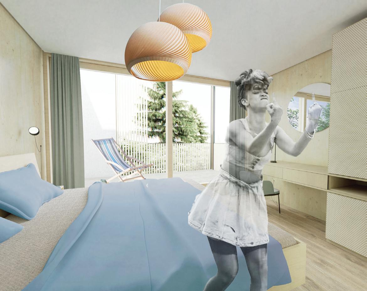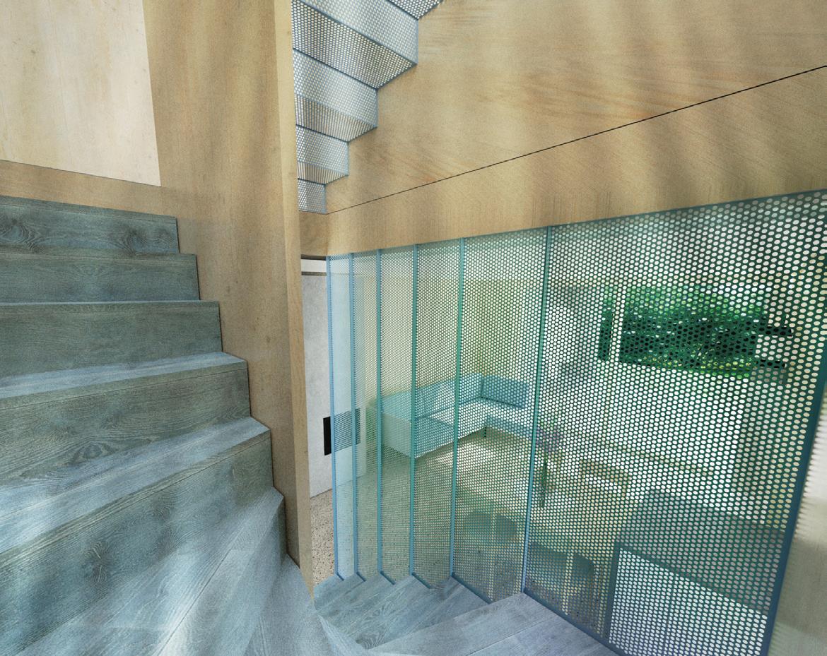 Návrh předpokládá konstrukci z CLT panelů na bázi dřeva. Domy budou z venku bíle omítané, ryzality a zábradlí budou tvořeny dřevěným laťováním. Rovněž okna budou dřevěná. V interiéru předpokládáme u některých stěn přiznaný dřevěný povrch. Stropy budou bíle omítané. Podlaha ve vstupním podlaží je z praktického a zároveň reprezentativního broušeného betonu. V celém objektu navrhujeme podlahové topení, takže podlaha nebude studená. Pro útulnější pocit z „obýváku“ je v prostoru před gaučem v ploše podlahy umístěný ostrov z dřevěné třívrstvé podlahoviny se zaoblenými rohy. Je to architektonická interpretace tradičního kusového koberce, měkčí kus podlahy, na která svádí k tomu si na ni sednout. Ve vyšších patrech jsou třívrstvé dřevěné podlahy, podlahy i stěny koupelen jsou opatřeny stěrkou. Výrazným prvkem interiéru je transparentní zábradlí a ve vyších patrech i schodišťová ramena z barevně lakovaného perforovaného plechu.