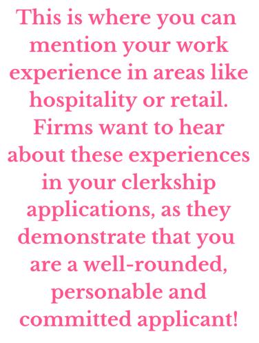 *Note: Do not underestimate the value of retail and hospitality experience! Employers want to hear about the skills and personal qualities you developed in this work. Law firms, in particular, are looking for well-rounded, personable and committed applicants.